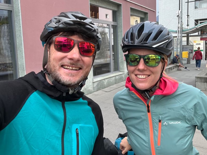 Am Morgen des 4. August zeigt sich das Engadin noch kühl, nur 9 °C zeigt das Thermometer um 8 Uhr. Wir stärken uns beim sehr feinen Frühstück und starten schließlich um 09.20 Uhr bei rund 12 °C zu unserer Etappe. Die Route führt uns zunächst entlang des Inns, in Richtung österreichische Grenze. Wir entscheiden uns anfangs für die gut asphaltierte Hauptstraße, obwohl später klar wird, dass auch ein wunderschöner Radweg direkt am Fluss entlangführt – teilweise mit Schotterbelag. Doch der Vorteil unserer Route: Wir rollen auf sanftem Gefälle stetig bergab, kommen gut voran und genießen atemberaubende Ausblicke auf das Wasser des Inn, das sich durch das Tal windet. Kurz nach dem kleinen Ort Martina überqueren wir die Grenze – wir verlassen die Schweiz und betreten Österreich. Hier beginnt der Anstieg zur Norbertshöhe. In mehreren Kehren führt uns die Strasse durch dichte Tannenwälder, flankiert von beeindruckenden Bergflanken. Immer wieder öffnet sich der Blick zurück ins Tal mit dem Fluss, der sich nun tief unter uns durch die Landschaft zieht. Kleine Wasserfälle plätschern am Strassenrand herab, die Luft ist frisch und klar. Der Anstieg ist dank den Kehren kurzweilig – aber wir sind nicht allein: Viele Radfahrer sind unterwegs, die meisten allerdings mit E-Bikes. Das Wetter ist weiterhin stark bewölkt, aber trocken. Auf 1405 m.ü.M. erreichen wir die Norbertshöhe – und rollen nach einer kurzen Pause bergab nach Nauders. Dort versuchen wir zunächst, ein kurzes Stück auf der Hauptstraße zum Reschenpass zu fahren, geben aber nach etwa 100 Metern wieder auf: zu viel Verkehr, überwiegend mit deutschen Autos, auf dem Weg nach Italien. Zum Glück gibt es einen hervorragend ausgebauten, asphaltierten Radweg, der direkt an den Bergbahnen von Nauders vorbeiführt, wo reger Betrieb mit Mountainbikern herrscht. Von hier beginnt der letzte sehr sanfte Anstieg bis zum Reschenpass. Kurz vor 12 Uhr erreichen wir die Passhöhe – und damit unser drittes Land auf dieser Reise: Italien mit der Region Südtirol-Trentino. Es folgen noch etwa 15 Minuten leichter Anstieg bis zum Reschensee, wo wir uns plötzlich mitten in Südtirol wiederfinden. Hier spricht man immer noch Deutsch. Es ist windig und immer noch bedeckt. Zwar fallen vereinzelt ein paar Tropfen, doch es bleibt trocken. Am malerischen Reschensee machen wir Mittagspause – in einem urigen Holzhütten-Restaurant, begleitet von Schlagermusik. Besonders interessant ist der Preisvergleich: Ein Tomate-Mozzarella-Salat, der uns gestern Abend in Scuol in der Schweiz noch 17 Franken kostete, steht hier für 9 Euro auf der Karte. Nach etwa einer Stunde Pause geht es weiter – aufgrund leichtem Regen, mit Regenjacke & Regenhosen. Wir folgen dem linken Ufer des Reschensees auf einem guten Schotterweg. Bei Graun kommen wir an einem der bekanntesten Fotomotive Südtirols vorbei: dem halb versunkenen Kirchturm von Alt-Graun. Er ragt mahnend aus dem See – ein stilles Denkmal an das untergegangene Dorf, das in den 1950er Jahren durch die Aufstauung geflutet wurde. Kurz darauf erreichen wir den Haidersee, an dessen rechter Uferseite wir auf einem separaten Radweg weiterfahren – die Kulisse bleibt eindrucksvoll. Nach dem See geht es zügig und steil bergab, auf gutem Asphalt, bis hinunter in das historische Dorf Burgeis, auf 1.200 m Höhe. Wir passieren enge Gassen, plätschernde Brunnen und jahrhundertealte Häuser – sehr eindrücklich. Gegen 14 Uhr fahren wir weiter Richtung Süden und erreichen bald darauf Glurns – die kleinste Stadt Südtirols, vollständig von einer mittelalterlichen Stadtmauer umgeben. Der Ort ist sehr touristisch, aber auch sehenswert. Wir gönnen uns einen Kaffee und schlendern kurz durch die Altstadt. Was uns auffällt: In dieser Region ist alles konsequent zweisprachig ausgeschildert – Deutsch und Italienisch stehen gleichberechtigt nebeneinander. Gegen 15.20 Uhr steigen wir wieder aufs Rad und folgen nun dem Fluss Etsch ostwärts. Ein paar Kilometer später sehen wir einen Wegweiser zum Stilfserjoch-Pass. Die Route über den Pass wäre eigentlich die grenznächste Route um die Schweiz. Da wir diesen Pass aber bereits mit dem Fahrrad einmal befahren haben, habe ich für die Umrundung der Schweiz eine neue Route gesucht, welche nun eben nach Meran führt. Zwischen Obstplantagen und dem nun bereits etwa sechs Meter breiten Fluss fahren wir die letzten 20 Kilometer auf meist asphaltierten Radwegen. Um 16:45 Uhr – nach rund 80 Kilometern – erreichen wir unser Tagesziel: Schlanders, auf 720 Metern über dem Meer. Die Landschaft ist inzwischen deutlich lieblicher – sanfte Hügel, Obstgärten und die Wärme des Südens sind nun allgegenwärtig.
