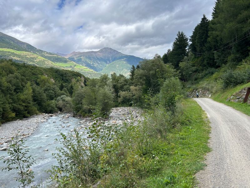 Am Morgen des 4. August zeigt sich das Engadin noch kühl, nur 9 °C zeigt das Thermometer um 8 Uhr. Wir stärken uns beim sehr feinen Frühstück und starten schließlich um 09.20 Uhr bei rund 12 °C zu unserer Etappe. Die Route führt uns zunächst entlang des Inns, in Richtung österreichische Grenze. Wir entscheiden uns anfangs für die gut asphaltierte Hauptstraße, obwohl später klar wird, dass auch ein wunderschöner Radweg direkt am Fluss entlangführt – teilweise mit Schotterbelag. Doch der Vorteil unserer Route: Wir rollen auf sanftem Gefälle stetig bergab, kommen gut voran und genießen atemberaubende Ausblicke auf das Wasser des Inn, das sich durch das Tal windet. Kurz nach dem kleinen Ort Martina überqueren wir die Grenze – wir verlassen die Schweiz und betreten Österreich. Hier beginnt der Anstieg zur Norbertshöhe. In mehreren Kehren führt uns die Strasse durch dichte Tannenwälder, flankiert von beeindruckenden Bergflanken. Immer wieder öffnet sich der Blick zurück ins Tal mit dem Fluss, der sich nun tief unter uns durch die Landschaft zieht. Kleine Wasserfälle plätschern am Strassenrand herab, die Luft ist frisch und klar. Der Anstieg ist dank den Kehren kurzweilig – aber wir sind nicht allein: Viele Radfahrer sind unterwegs, die meisten allerdings mit E-Bikes. Das Wetter ist weiterhin stark bewölkt, aber trocken. Auf 1405 m.ü.M. erreichen wir die Norbertshöhe – und rollen nach einer kurzen Pause bergab nach Nauders. Dort versuchen wir zunächst, ein kurzes Stück auf der Hauptstraße zum Reschenpass zu fahren, geben aber nach etwa 100 Metern wieder auf: zu viel Verkehr, überwiegend mit deutschen Autos, auf dem Weg nach Italien. Zum Glück gibt es einen hervorragend ausgebauten, asphaltierten Radweg, der direkt an den Bergbahnen von Nauders vorbeiführt, wo reger Betrieb mit Mountainbikern herrscht. Von hier beginnt der letzte sehr sanfte Anstieg bis zum Reschenpass. Kurz vor 12 Uhr erreichen wir die Passhöhe – und damit unser drittes Land auf dieser Reise: Italien mit der Region Südtirol-Trentino. Es folgen noch etwa 15 Minuten leichter Anstieg bis zum Reschensee, wo wir uns plötzlich mitten in Südtirol wiederfinden. Hier spricht man immer noch Deutsch. Es ist windig und immer noch bedeckt. Zwar fallen vereinzelt ein paar Tropfen, doch es bleibt trocken. Am malerischen Reschensee machen wir Mittagspause – in einem urigen Holzhütten-Restaurant, begleitet von Schlagermusik. Besonders interessant ist der Preisvergleich: Ein Tomate-Mozzarella-Salat, der uns gestern Abend in Scuol in der Schweiz noch 17 Franken kostete, steht hier für 9 Euro auf der Karte. Nach etwa einer Stunde Pause geht es weiter – aufgrund leichtem Regen, mit Regenjacke & Regenhosen. Wir folgen dem linken Ufer des Reschensees auf einem guten Schotterweg. Bei Graun kommen wir an einem der bekanntesten Fotomotive Südtirols vorbei: dem halb versunkenen Kirchturm von Alt-Graun. Er ragt mahnend aus dem See – ein stilles Denkmal an das untergegangene Dorf, das in den 1950er Jahren durch die Aufstauung geflutet wurde. Kurz darauf erreichen wir den Haidersee, an dessen rechter Uferseite wir auf einem separaten Radweg weiterfahren – die Kulisse bleibt eindrucksvoll. Nach dem See geht es zügig und steil bergab, auf gutem Asphalt, bis hinunter in das historische Dorf Burgeis, auf 1.200 m Höhe. Wir passieren enge Gassen, plätschernde Brunnen und jahrhundertealte Häuser – sehr eindrücklich. Gegen 14 Uhr fahren wir weiter Richtung Süden und erreichen bald darauf Glurns – die kleinste Stadt Südtirols, vollständig von einer mittelalterlichen Stadtmauer umgeben. Der Ort ist sehr touristisch, aber auch sehenswert. Wir gönnen uns einen Kaffee und schlendern kurz durch die Altstadt. Was uns auffällt: In dieser Region ist alles konsequent zweisprachig ausgeschildert – Deutsch und Italienisch stehen gleichberechtigt nebeneinander. Gegen 15.20 Uhr steigen wir wieder aufs Rad und folgen nun dem Fluss Etsch ostwärts. Ein paar Kilometer später sehen wir einen Wegweiser zum Stilfserjoch-Pass. Die Route über den Pass wäre eigentlich die grenznächste Route um die Schweiz. Da wir diesen Pass aber bereits mit dem Fahrrad einmal befahren haben, habe ich für die Umrundung der Schweiz eine neue Route gesucht, welche nun eben nach Meran führt. Zwischen Obstplantagen und dem nun bereits etwa sechs Meter breiten Fluss fahren wir die letzten 20 Kilometer auf meist asphaltierten Radwegen. Um 16:45 Uhr – nach rund 80 Kilometern – erreichen wir unser Tagesziel: Schlanders, auf 720 Metern über dem Meer. Die Landschaft ist inzwischen deutlich lieblicher – sanfte Hügel, Obstgärten und die Wärme des Südens sind nun allgegenwärtig.