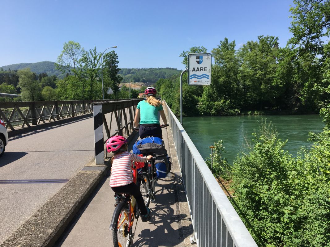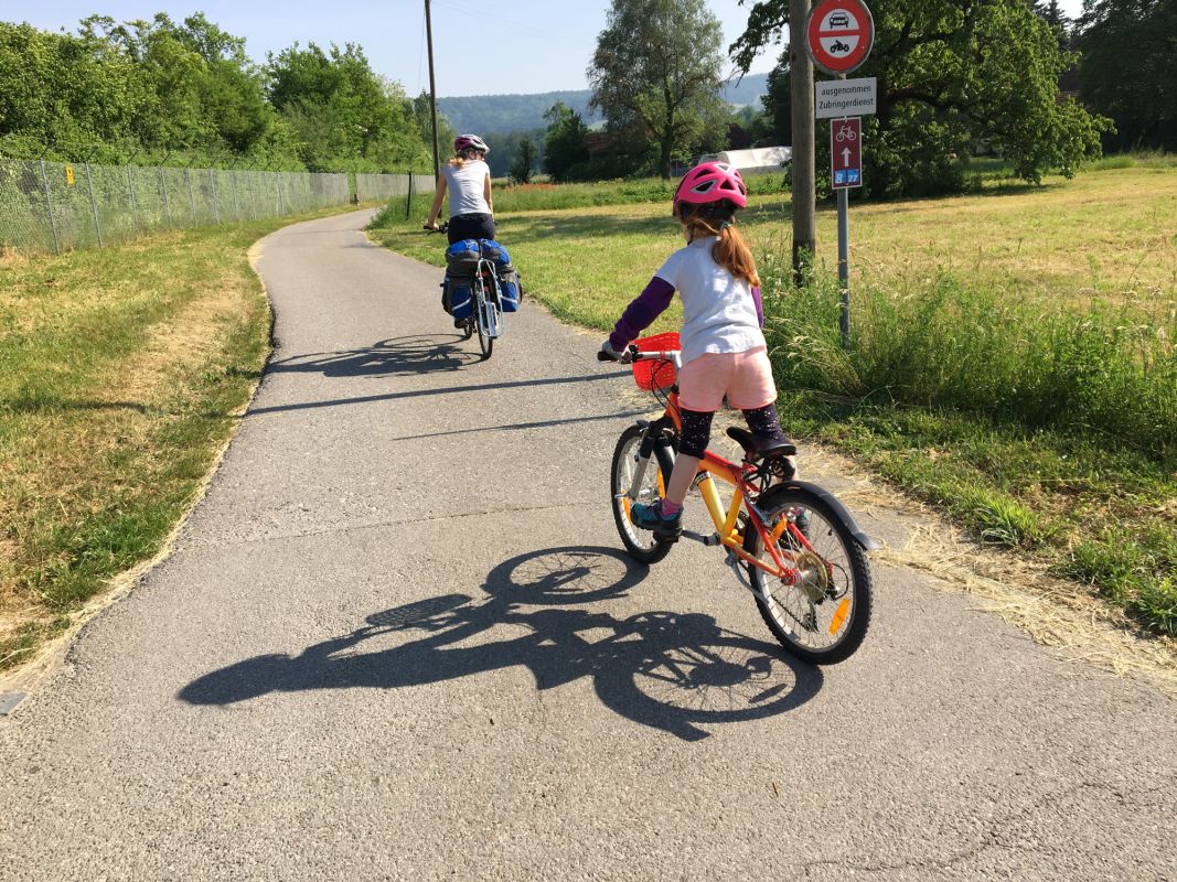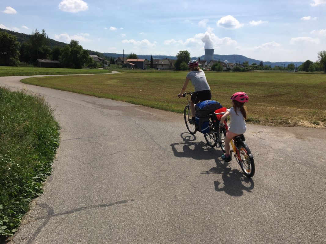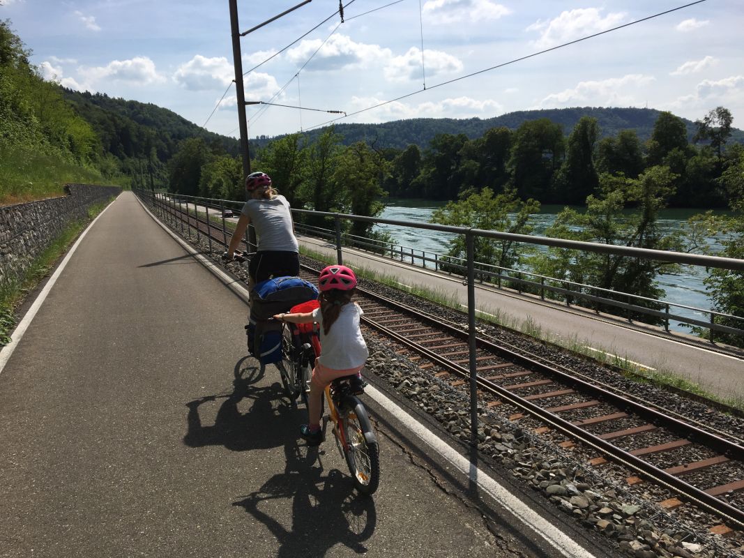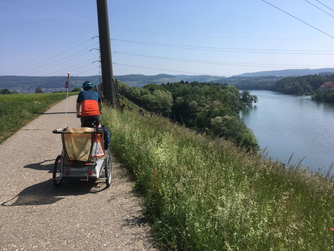 Zu unserer letzten Etappe starteten wir gegen 09.20 Uhr, wohl motiviert durch die anderen Kinder der Jugendherberge begann auch unsere Tochter die Tour auf ihrem eigenen Velo (also ohne Follow me). Auf der Aare-Route 8 Während ca. 8 km über Asphalt und Schotterwege inkl. einem ersten knackigen Aufstieg unmittelbar nach der Ortschaft Stilli reichte ihre Motivation bei sonnigen, warmen Wetter aus, danach benötigte sie etwas Erholung. Auch unsere Kräfte wurden danach noch zweimal stärker als erwartet gefordert. Die Steigungen nach Villigen (mit Schwimmbad) und später hoch zum Schmidberg (387 m.ü.M.) bei Böttstein hatten es in sich, primär weil sie sehr steil waren und sich allesamt innerhalb 5 km befanden. Da darf die offizielle Bewertung „leicht“ zumindest im Zusammenhang mit jüngeren Kindern durchaus hinterfragt werden (dies gilt nur für diesen Abschnitt). Wir genossen jedoch im ersten Teil immer wieder schöne Abschnitte mit naher Sicht auf die Aare und beim Beobachtungsturm am Klingnauer Stausee machten wir einen Halt, um den 10m hohen, öffentlich und gratis zugänglichen Turm zu besteigen und die Tierwelt, primär der reichen Vogelwelt, zu besichtigen. Als wir dann weiterfahren wollten, überraschte uns dann ein platter Hinterreifen, welcher unsere Weiterfahrt sowie das anstehende Mittagessen kurzerhand etwas verzögerte. Gegen 13.00 Uhr erreichten wir Koblenz, wo die Aare in den Rhein mündet. Nach der Mittagspause verabschiedeten wir uns von der Aare und setzten die Route nun auf der Rhein-Route 2 Richtung Laufenburg fort. Der Abschnitt führte öfters auf Schotterwegen vorbei am Kernkraftwerk Leibstadt, entlang der Bahnlinie, dem Rhein bis nach Laufenburg, wo unsere Fahrradtour gegen 15.40 Uhr mit einer Tagesetappe von 38 km bzw. einer Tourdistanz von 106 km endete. Mit der S Bahn gings dann problemlos zurück nach Basel.