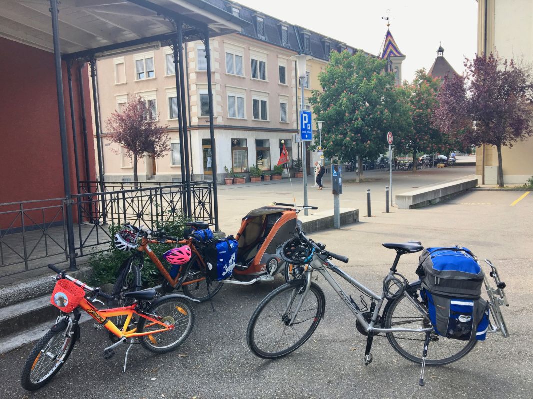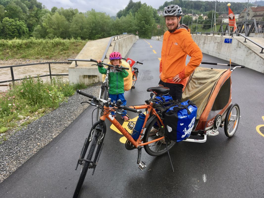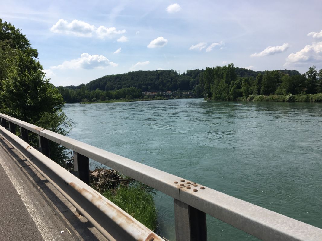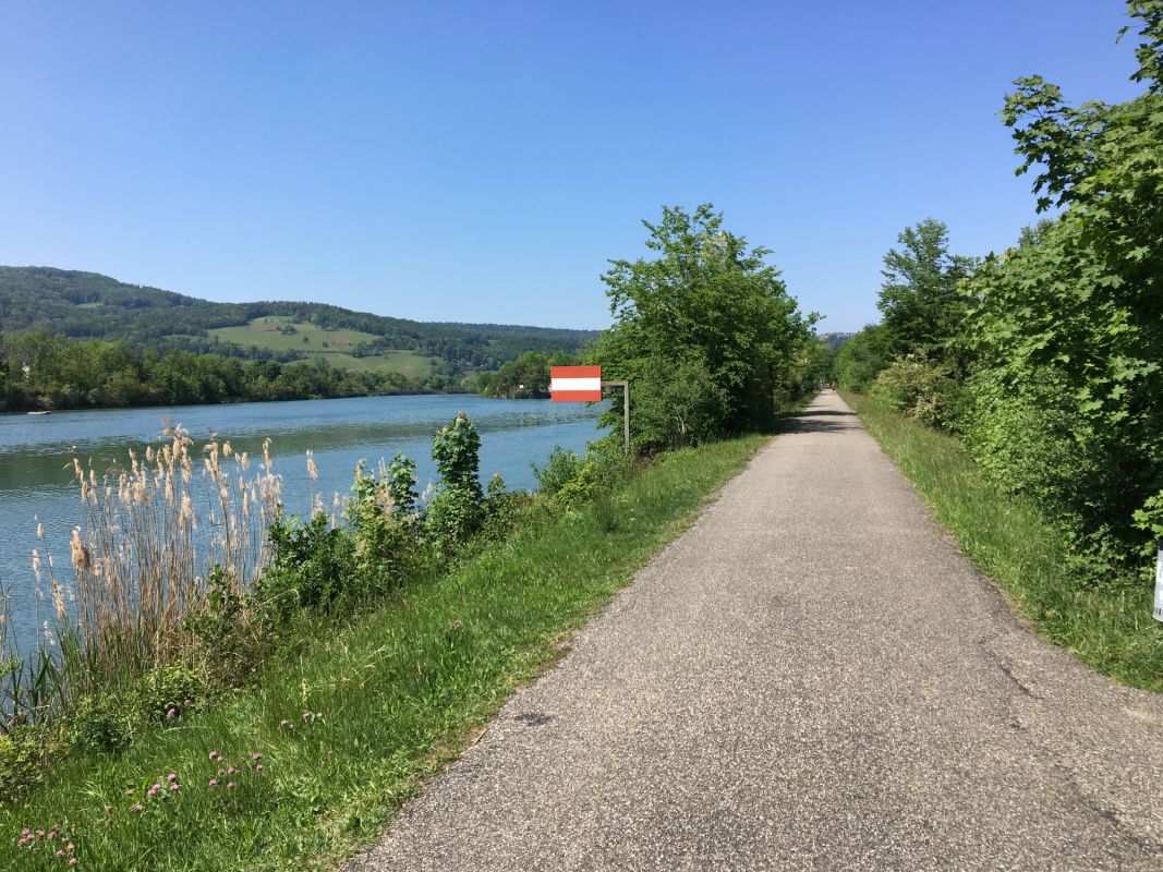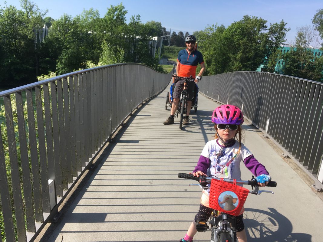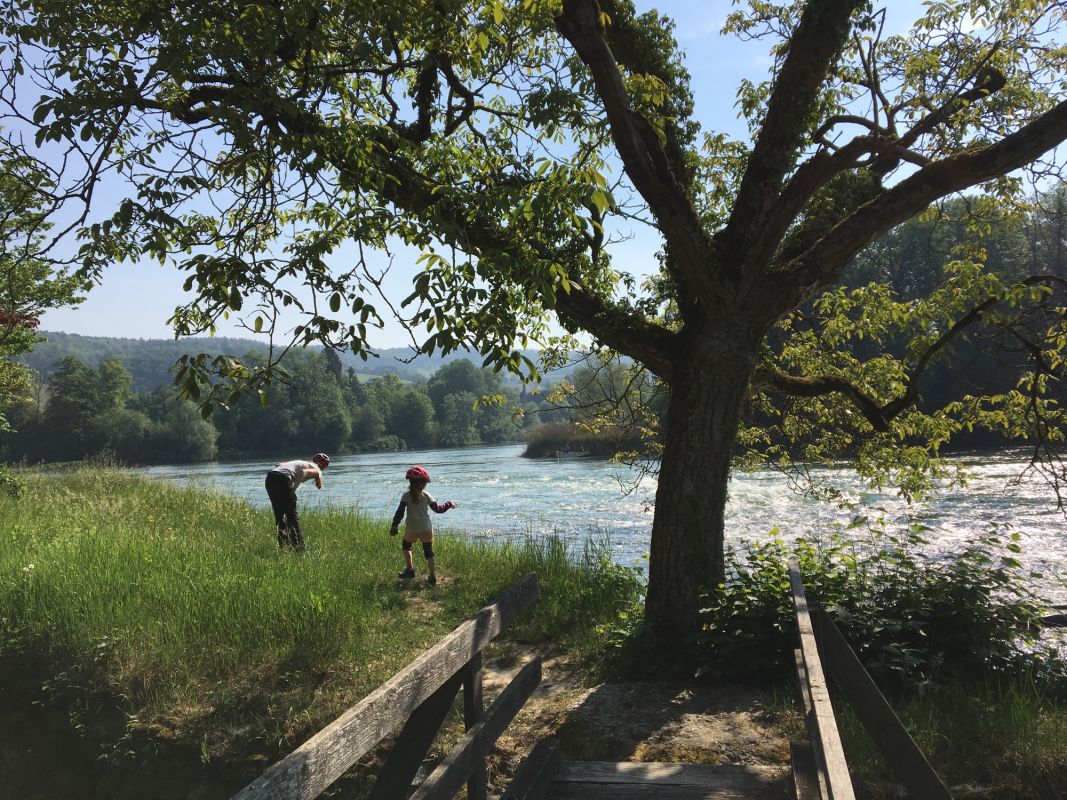 Zu unserer letzten Etappe starteten wir gegen 09.20 Uhr, wohl motiviert durch die anderen Kinder der Jugendherberge begann auch unsere Tochter die Tour auf ihrem eigenen Velo (also ohne Follow me). Auf der Aare-Route 8 Während ca. 8 km über Asphalt und Schotterwege inkl. einem ersten knackigen Aufstieg unmittelbar nach der Ortschaft Stilli reichte ihre Motivation bei sonnigen, warmen Wetter aus, danach benötigte sie etwas Erholung. Auch unsere Kräfte wurden danach noch zweimal stärker als erwartet gefordert. Die Steigungen nach Villigen (mit Schwimmbad) und später hoch zum Schmidberg (387 m.ü.M.) bei Böttstein hatten es in sich, primär weil sie sehr steil waren und sich allesamt innerhalb 5 km befanden. Da darf die offizielle Bewertung „leicht“ zumindest im Zusammenhang mit jüngeren Kindern durchaus hinterfragt werden (dies gilt nur für diesen Abschnitt). Wir genossen jedoch im ersten Teil immer wieder schöne Abschnitte mit naher Sicht auf die Aare und beim Beobachtungsturm am Klingnauer Stausee machten wir einen Halt, um den 10m hohen, öffentlich und gratis zugänglichen Turm zu besteigen und die Tierwelt, primär der reichen Vogelwelt, zu besichtigen. Als wir dann weiterfahren wollten, überraschte uns dann ein platter Hinterreifen, welcher unsere Weiterfahrt sowie das anstehende Mittagessen kurzerhand etwas verzögerte. Gegen 13.00 Uhr erreichten wir Koblenz, wo die Aare in den Rhein mündet. Nach der Mittagspause verabschiedeten wir uns von der Aare und setzten die Route nun auf der Rhein-Route 2 Richtung Laufenburg fort. Der Abschnitt führte öfters auf Schotterwegen vorbei am Kernkraftwerk Leibstadt, entlang der Bahnlinie, dem Rhein bis nach Laufenburg, wo unsere Fahrradtour gegen 15.40 Uhr mit einer Tagesetappe von 38 km bzw. einer Tourdistanz von 106 km endete. Mit der S Bahn gings dann problemlos zurück nach Basel.