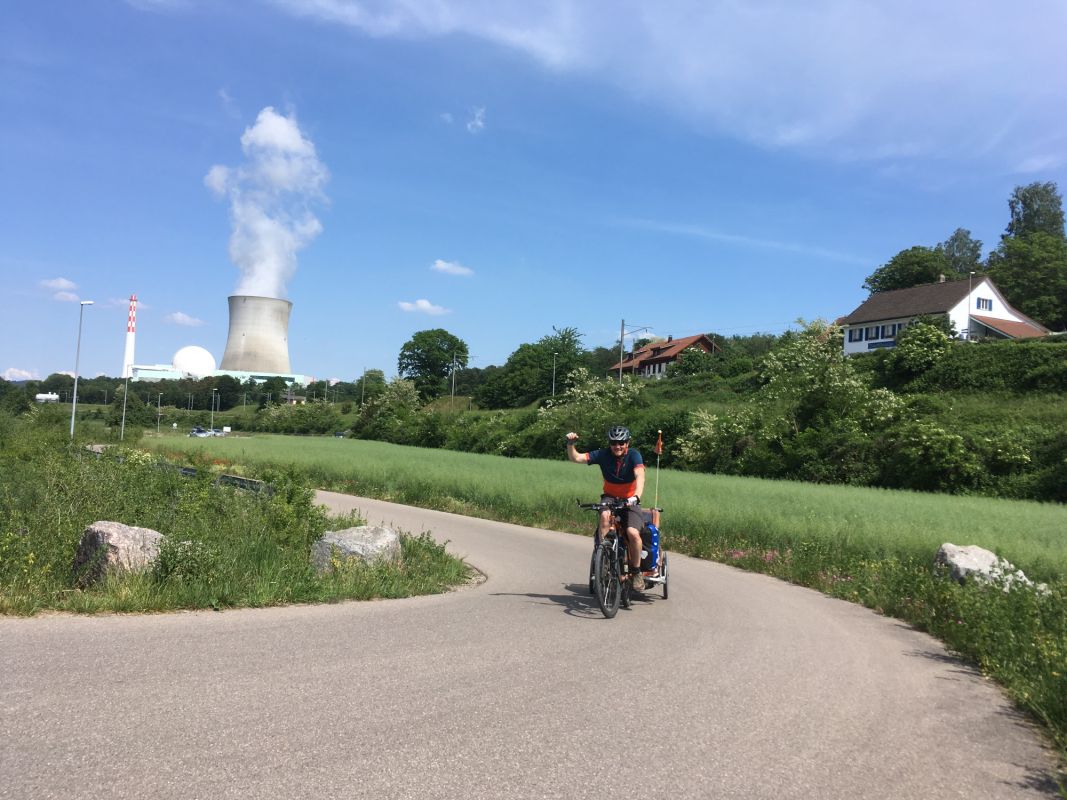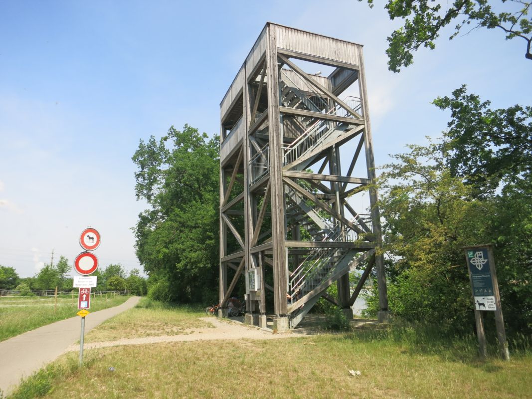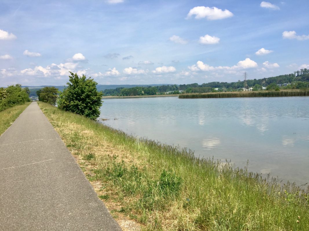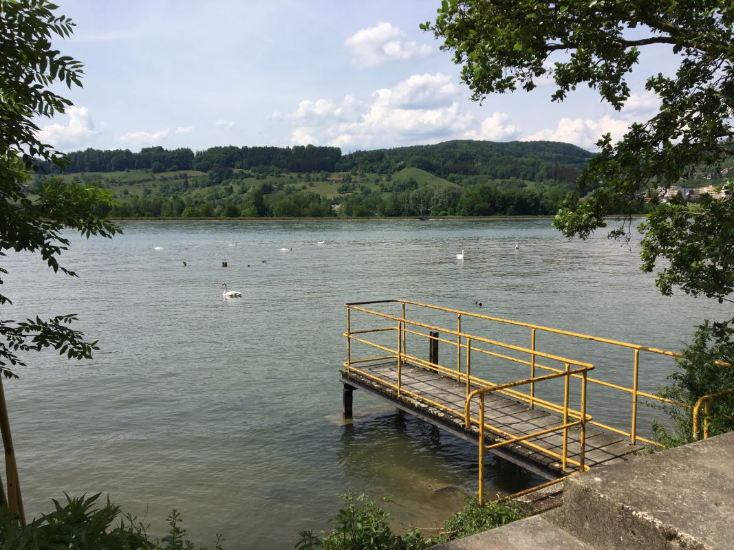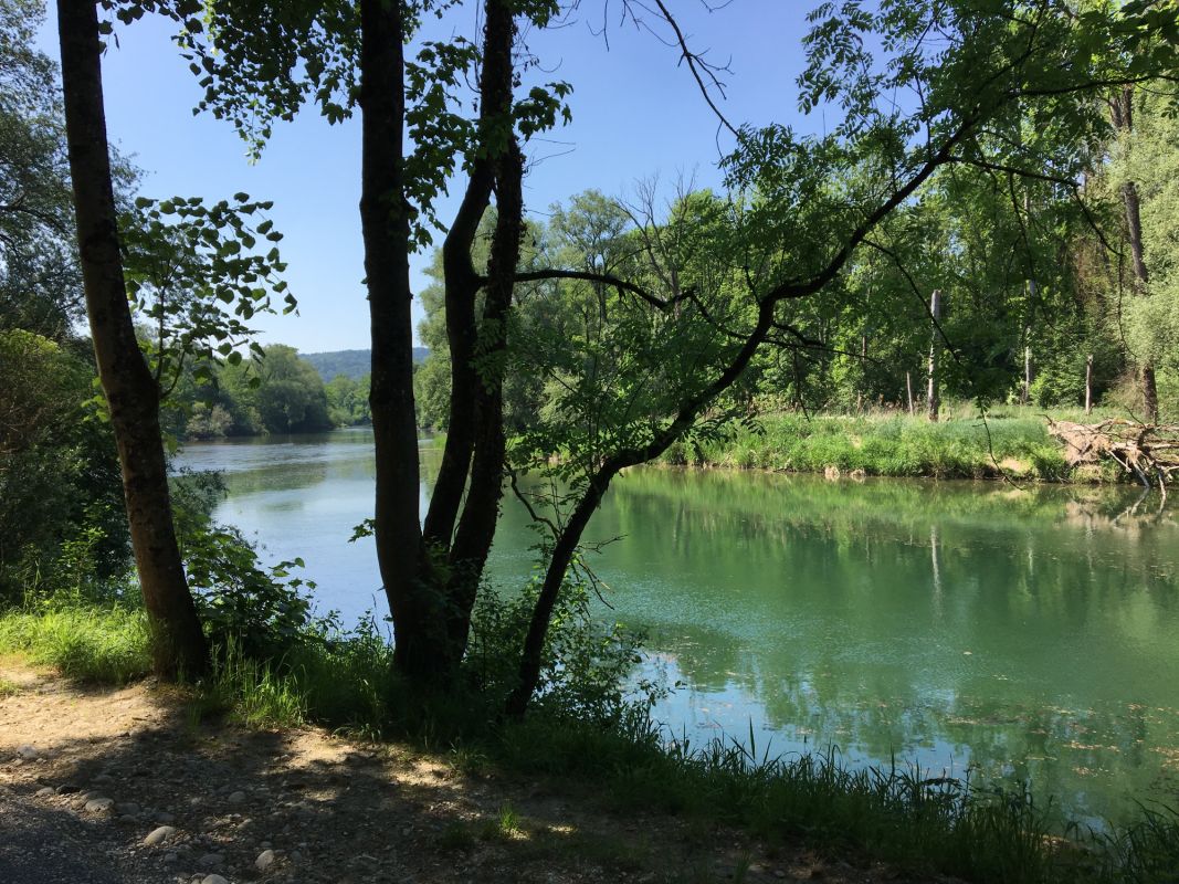 Zu unserer letzten Etappe starteten wir gegen 09.20 Uhr, wohl motiviert durch die anderen Kinder der Jugendherberge begann auch unsere Tochter die Tour auf ihrem eigenen Velo (also ohne Follow me). Auf der Aare-Route 8 Während ca. 8 km über Asphalt und Schotterwege inkl. einem ersten knackigen Aufstieg unmittelbar nach der Ortschaft Stilli reichte ihre Motivation bei sonnigen, warmen Wetter aus, danach benötigte sie etwas Erholung. Auch unsere Kräfte wurden danach noch zweimal stärker als erwartet gefordert. Die Steigungen nach Villigen (mit Schwimmbad) und später hoch zum Schmidberg (387 m.ü.M.) bei Böttstein hatten es in sich, primär weil sie sehr steil waren und sich allesamt innerhalb 5 km befanden. Da darf die offizielle Bewertung „leicht“ zumindest im Zusammenhang mit jüngeren Kindern durchaus hinterfragt werden (dies gilt nur für diesen Abschnitt). Wir genossen jedoch im ersten Teil immer wieder schöne Abschnitte mit naher Sicht auf die Aare und beim Beobachtungsturm am Klingnauer Stausee machten wir einen Halt, um den 10m hohen, öffentlich und gratis zugänglichen Turm zu besteigen und die Tierwelt, primär der reichen Vogelwelt, zu besichtigen. Als wir dann weiterfahren wollten, überraschte uns dann ein platter Hinterreifen, welcher unsere Weiterfahrt sowie das anstehende Mittagessen kurzerhand etwas verzögerte. Gegen 13.00 Uhr erreichten wir Koblenz, wo die Aare in den Rhein mündet. Nach der Mittagspause verabschiedeten wir uns von der Aare und setzten die Route nun auf der Rhein-Route 2 Richtung Laufenburg fort. Der Abschnitt führte öfters auf Schotterwegen vorbei am Kernkraftwerk Leibstadt, entlang der Bahnlinie, dem Rhein bis nach Laufenburg, wo unsere Fahrradtour gegen 15.40 Uhr mit einer Tagesetappe von 38 km bzw. einer Tourdistanz von 106 km endete. Mit der S Bahn gings dann problemlos zurück nach Basel.