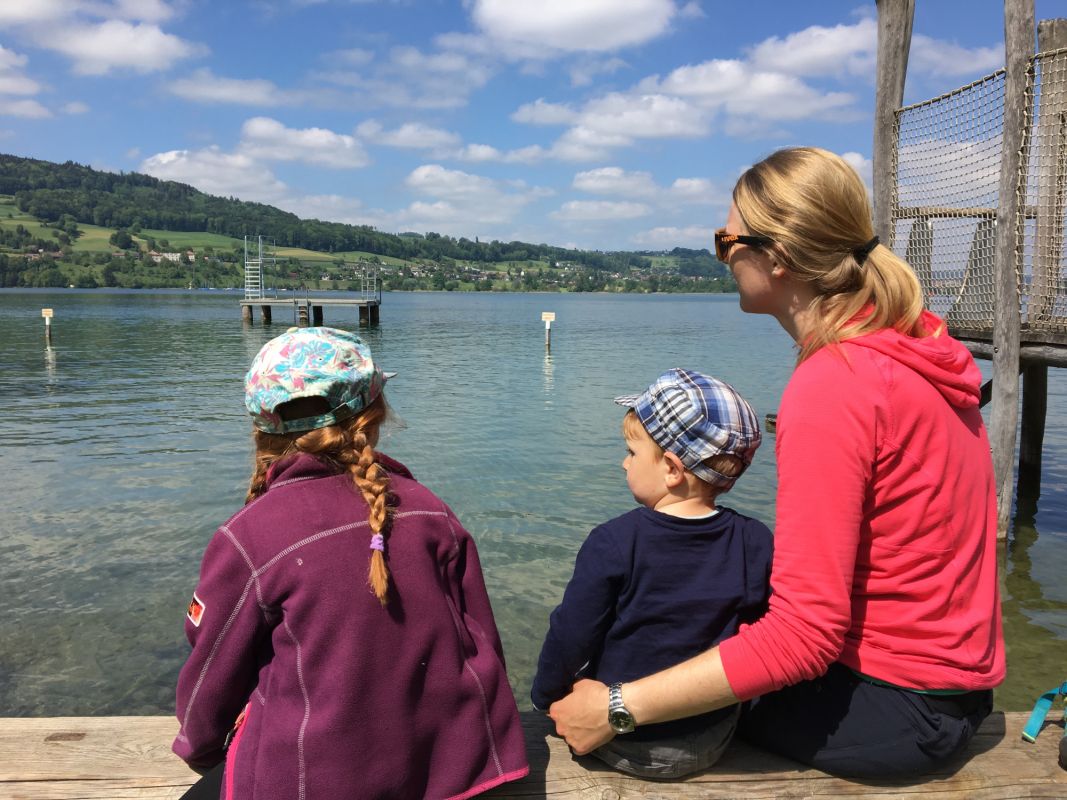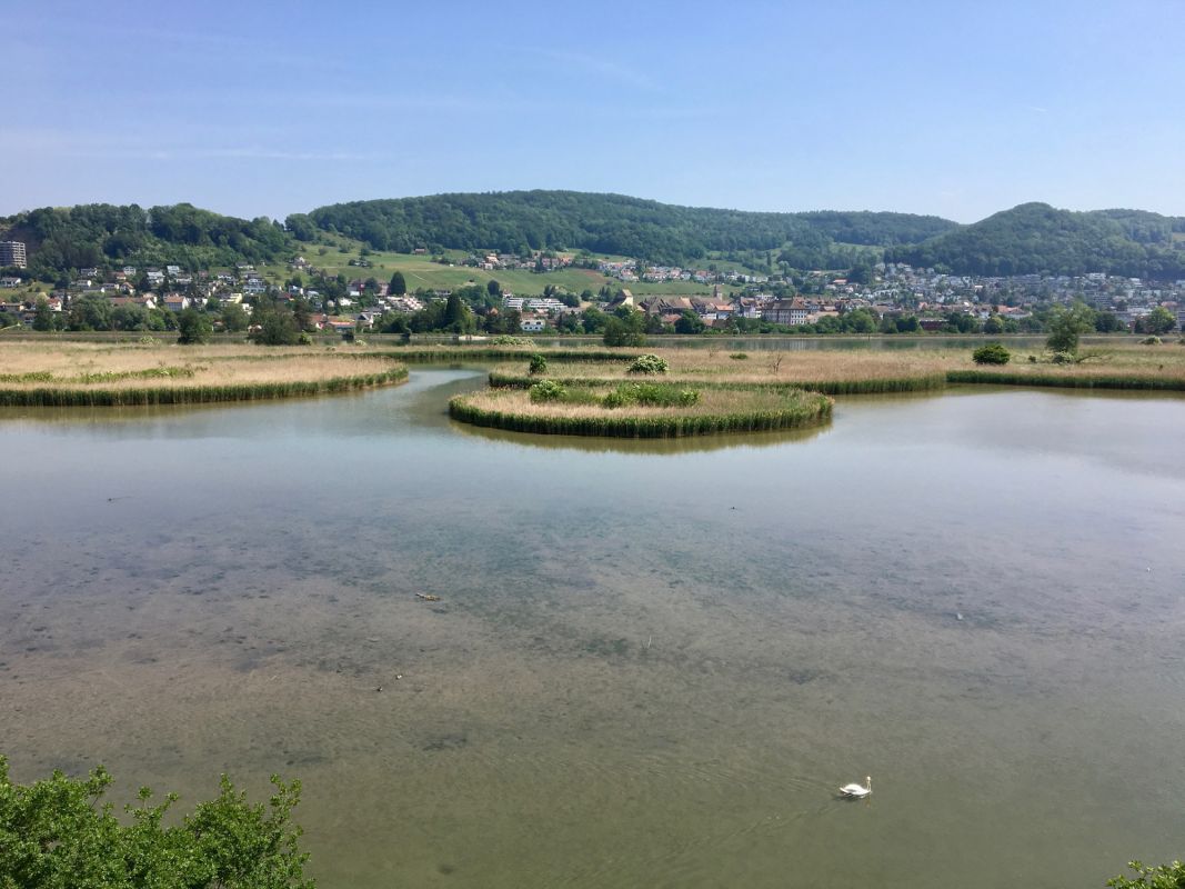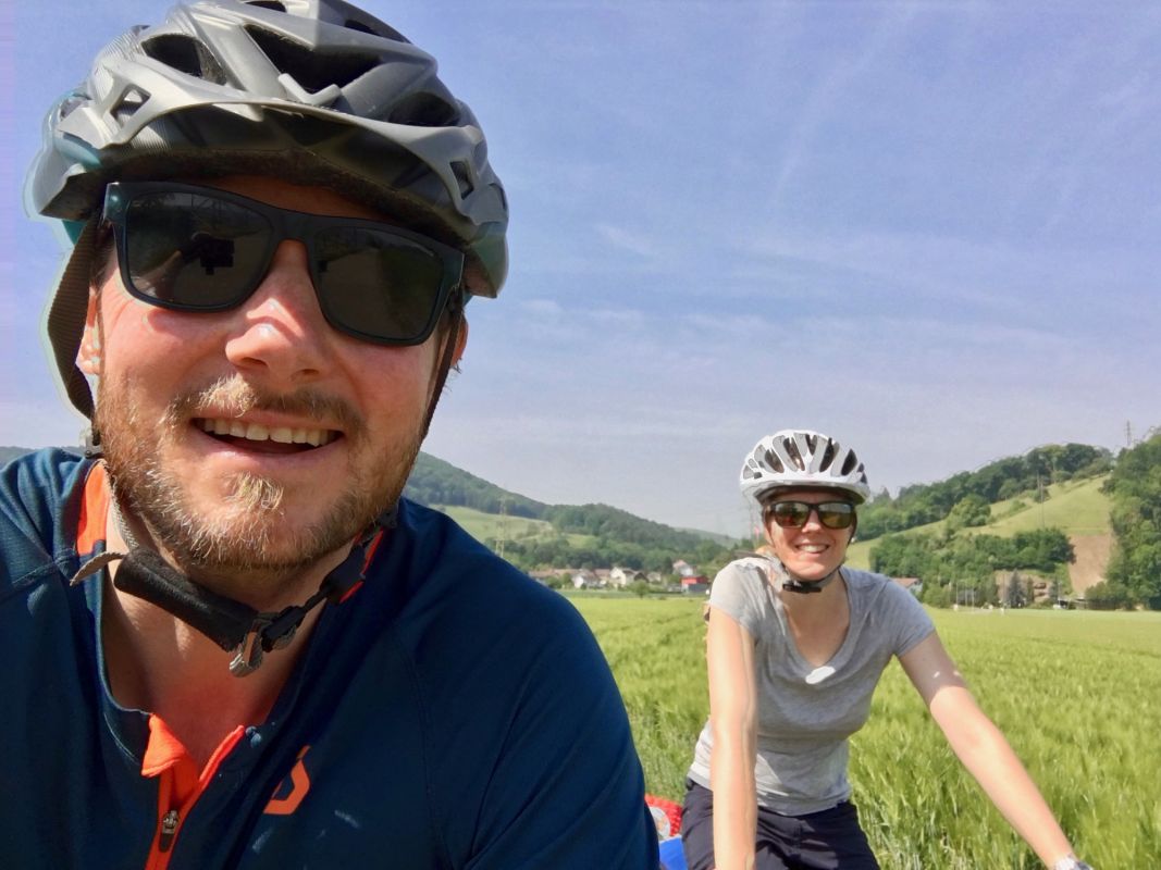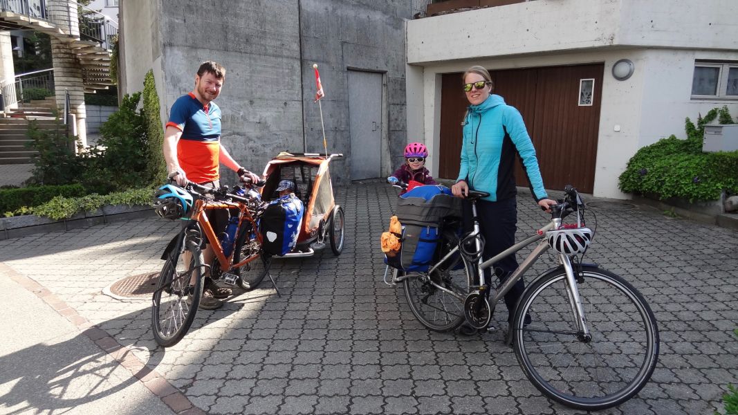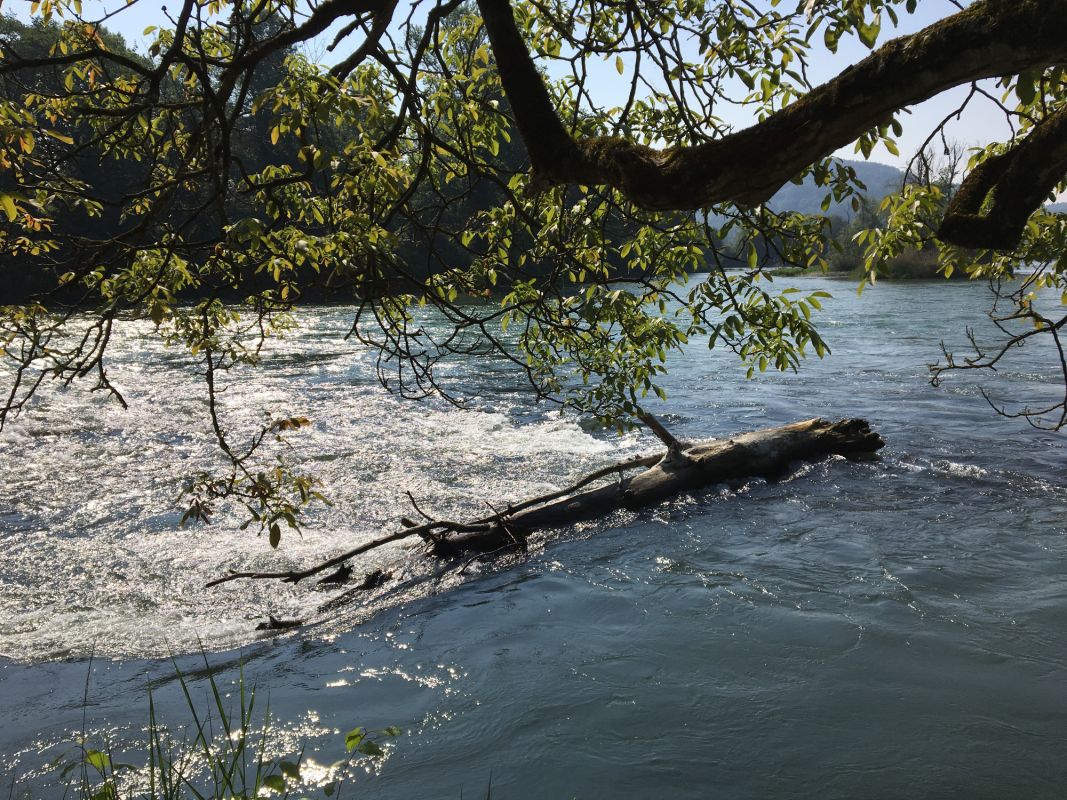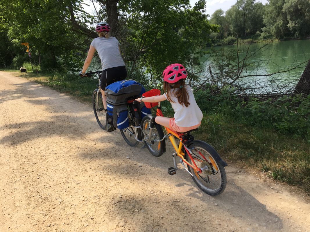Zu unserer letzten Etappe starteten wir gegen 09.20 Uhr, wohl motiviert durch die anderen Kinder der Jugendherberge begann auch unsere Tochter die Tour auf ihrem eigenen Velo (also ohne Follow me). Auf der Aare-Route 8 Während ca. 8 km über Asphalt und Schotterwege inkl. einem ersten knackigen Aufstieg unmittelbar nach der Ortschaft Stilli reichte ihre Motivation bei sonnigen, warmen Wetter aus, danach benötigte sie etwas Erholung. Auch unsere Kräfte wurden danach noch zweimal stärker als erwartet gefordert. Die Steigungen nach Villigen (mit Schwimmbad) und später hoch zum Schmidberg (387 m.ü.M.) bei Böttstein hatten es in sich, primär weil sie sehr steil waren und sich allesamt innerhalb 5 km befanden. Da darf die offizielle Bewertung „leicht“ zumindest im Zusammenhang mit jüngeren Kindern durchaus hinterfragt werden (dies gilt nur für diesen Abschnitt). Wir genossen jedoch im ersten Teil immer wieder schöne Abschnitte mit naher Sicht auf die Aare und beim Beobachtungsturm am Klingnauer Stausee machten wir einen Halt, um den 10m hohen, öffentlich und gratis zugänglichen Turm zu besteigen und die Tierwelt, primär der reichen Vogelwelt, zu besichtigen. Als wir dann weiterfahren wollten, überraschte uns dann ein platter Hinterreifen, welcher unsere Weiterfahrt sowie das anstehende Mittagessen kurzerhand etwas verzögerte. Gegen 13.00 Uhr erreichten wir Koblenz, wo die Aare in den Rhein mündet. Nach der Mittagspause verabschiedeten wir uns von der Aare und setzten die Route nun auf der Rhein-Route 2 Richtung Laufenburg fort. Der Abschnitt führte öfters auf Schotterwegen vorbei am Kernkraftwerk Leibstadt, entlang der Bahnlinie, dem Rhein bis nach Laufenburg, wo unsere Fahrradtour gegen 15.40 Uhr mit einer Tagesetappe von 38 km bzw. einer Tourdistanz von 106 km endete. Mit der S Bahn gings dann problemlos zurück nach Basel.