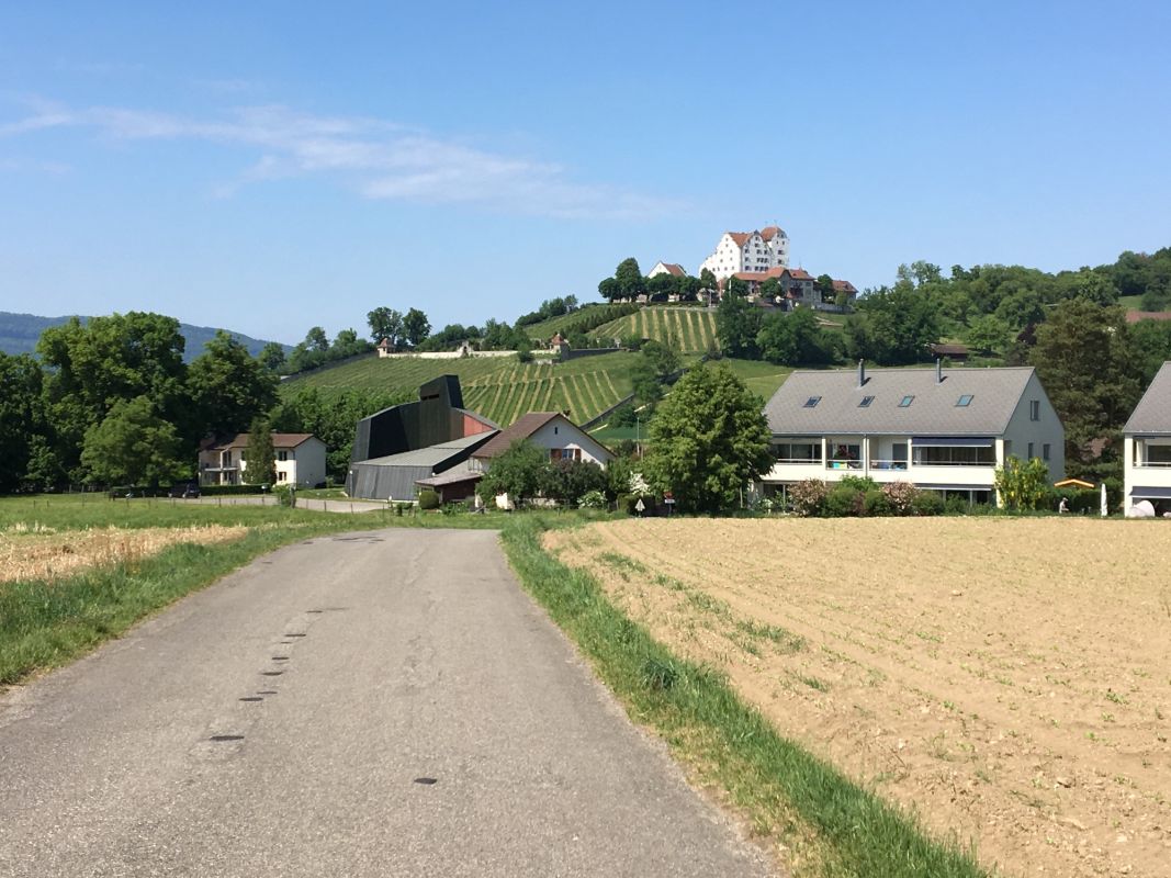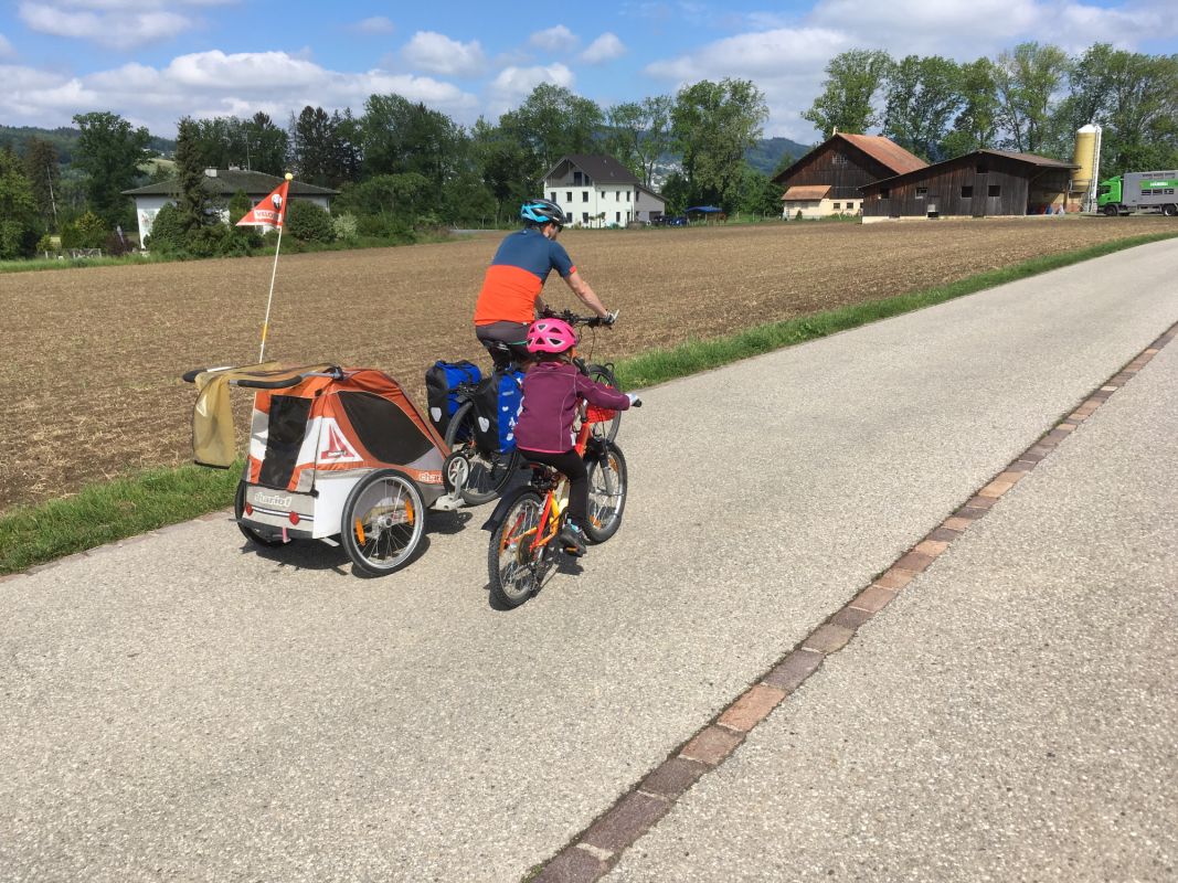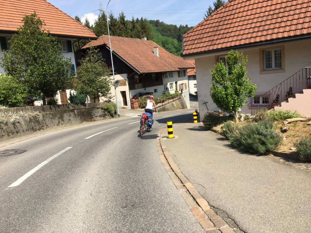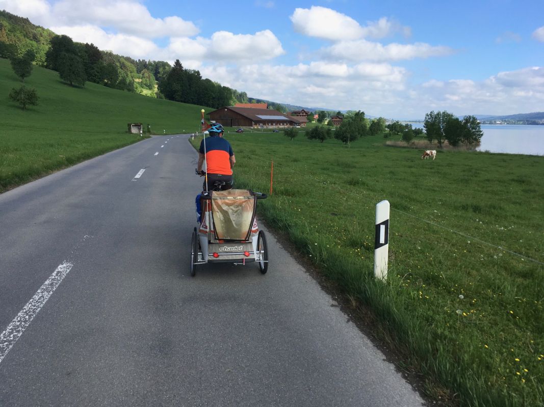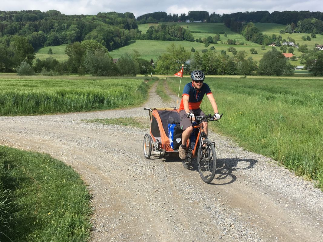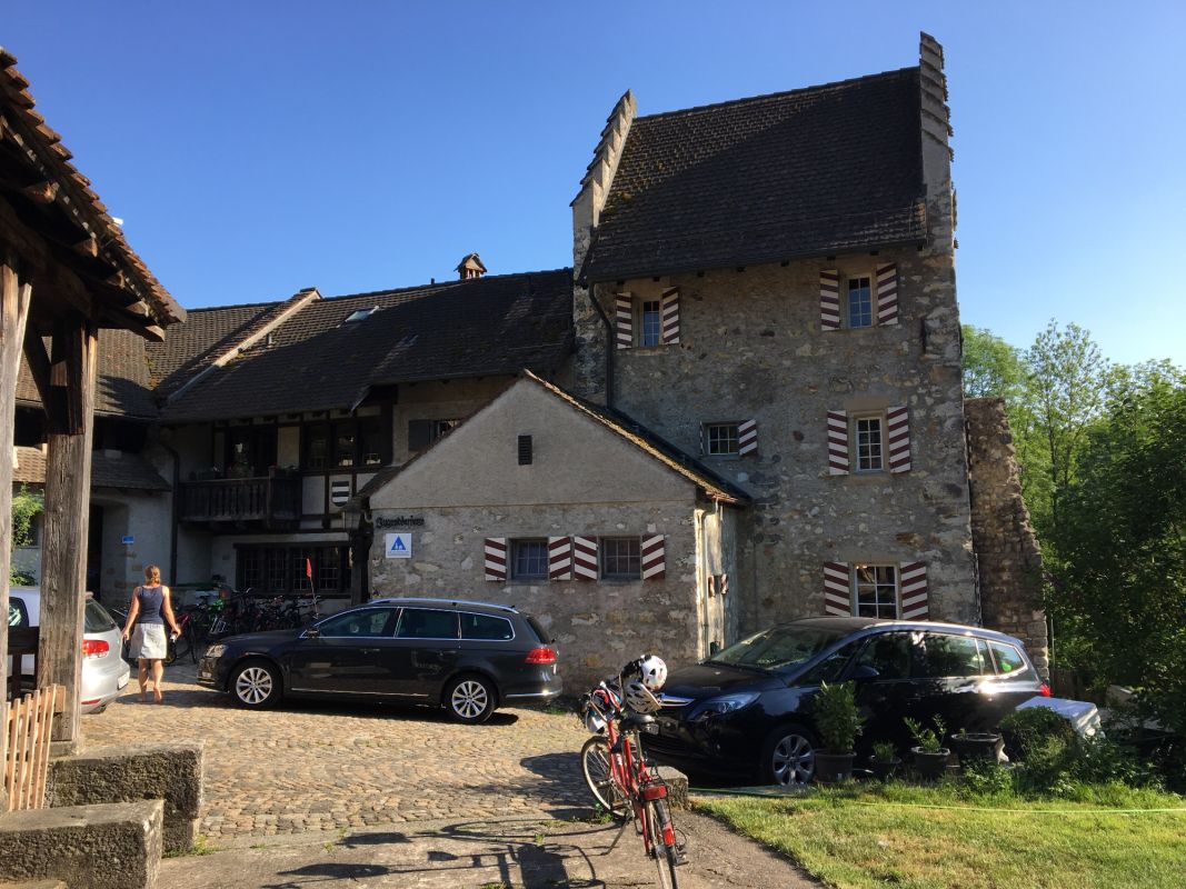 Um 09.30 Uhr starteten wir in Hochdorf (474 m.ü.M.) bei sonnigen Verhältnissen zur 2.Etappe. Wir folgten der Seetal-Bözberg Route 56 durch landwirtschaftliches Gebiet mit vielen Bauernhöfen, oft mit eigenem Hoflädeli, genossen regelmässig die Aussicht auf den Baldeggersee und später den Hallwilersee. Der Strassenbelag wechselte dabei regelmässig zwischen Asphalt und Schotter, was aber auch mit Anhänger gut zu bewältigen war. Nach einem kurzen Aufstieg nach Meisterschwanden (505 m.ü.M.) folgte die Abfahrt hinunter ins Arbeiterstrandbad (mit Campingplatz) Tennwil am Hallwilersee (449 m.ü.M.). Auf dem Spielplatz dort bewegten wir nochmals unsere Beine und probten unsere Kletterfähigkeiten, besonders wichtig für unseren Jüngsten im Fahrradanhänger, bevor wir uns das Mittagessen gönnten. Gestärkt und nur mit wenig Steigungen fuhren wir durch schöne Feldwiesen und Waldgebiete Richtung Lenzburg und erreichten wenig später die Aare. Diese überquerten wir und folgten am östlichen Rand des Juraparks Aargau weitgehend dem Flussverlauf der Aare und erreichten nach 48 km gegen 15.30 Uhr die Jugendherberge in Brugg (342 m.ü.M.), welche sich im wunderschönen Schlössli Altenburg befindet. Durch unsere frühe Ankunftszeit hatten wir noch Zeit, den nahen grossen Spielplatz aufzusuchen und im Schwimmbad (Frei- und Hallenbad) nebenan Getränke und Glace zu holen (da wir nicht mit so warmem Wetter gerechnet hatten, blieben unsere Badekleider im Schrank zuhause). Am Abend staunten wir dann in der Jugendherberge, wieviele Familien mit ihren Kinder mit dem Fahrrad unterwegs waren und hier übernachteten. Vor der Jugendherberge standen etliche Fahrräder mit Follow me, Kinderfahrräder, Kinderanhänger etc. und so ergaben sich ein paar interessante Gespräche am Esstisch draussen.