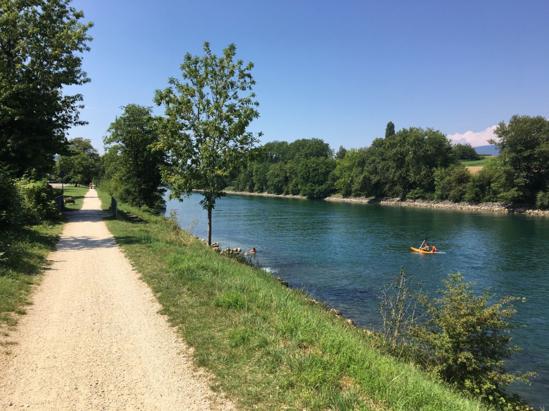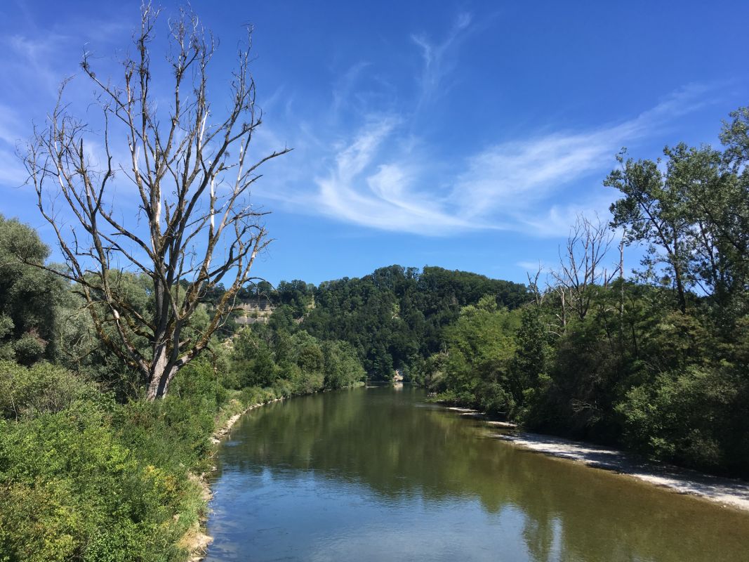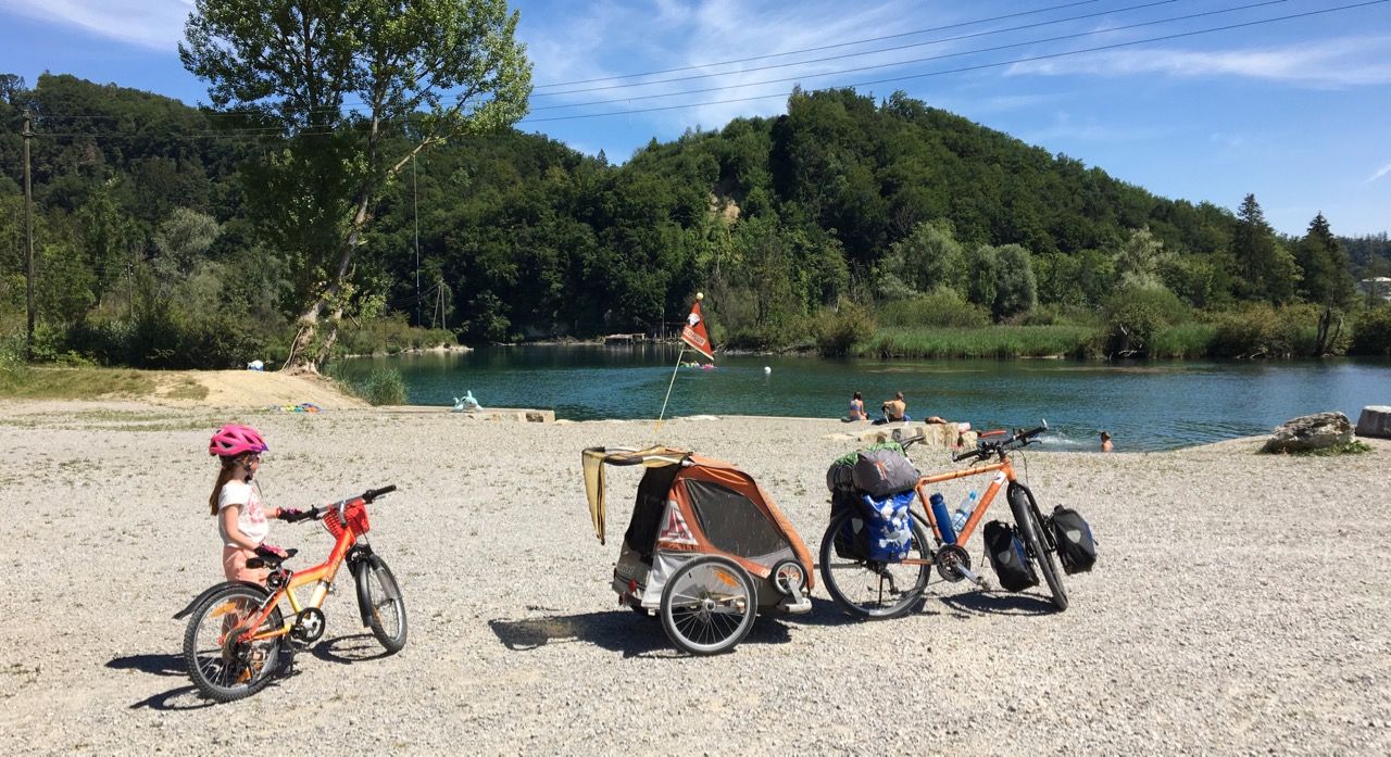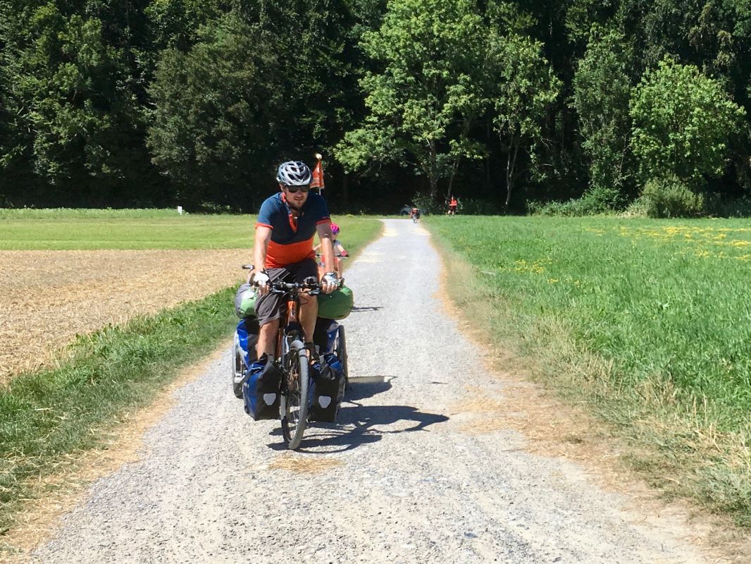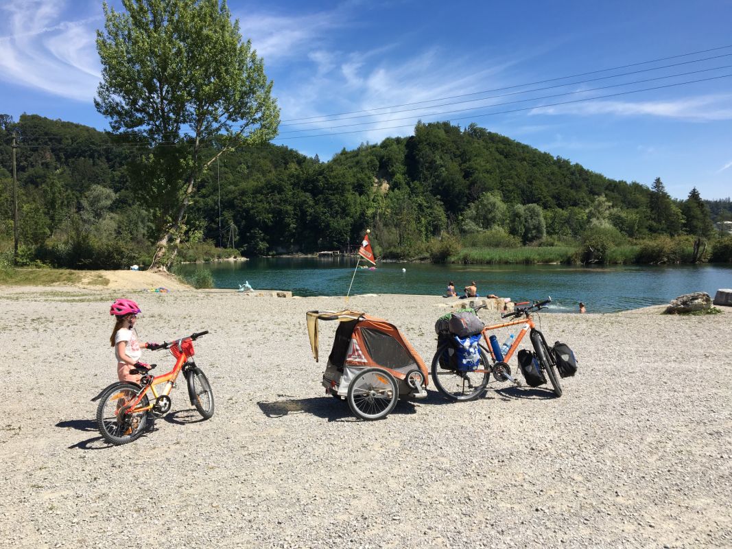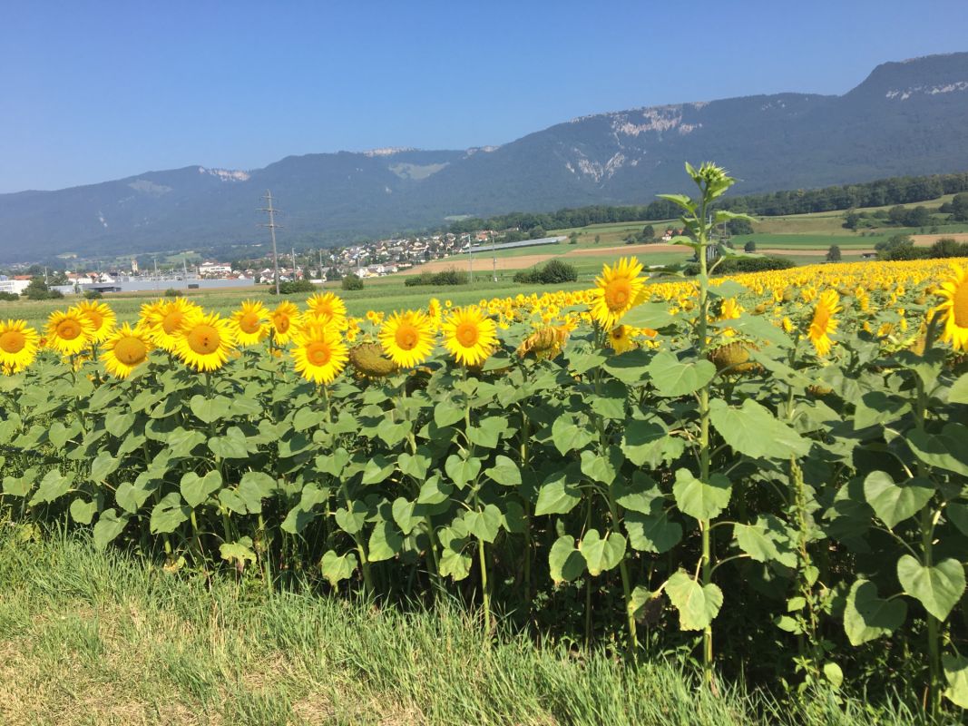 Gegen halb elf Uhr morgens nahmen wir den Zug Richtung Olten. Wir entschieden uns für die langsamere S-Bahn, da wir unter normalen Umständen mit genügend Platz für unsere 3 Fahrräder und den Fahrradanhänger erwarten sowie der Zustieg in den Zug eben, also ohne Treppen erfolgt. Erstmals mit dabei auf der Familien-Fahrradtour war unser Zelt mit entsprechend Schlafunterlagen, Schlafsäcken, Gas-Kocher etc. Da für die ganze Woche Sonnenschein und Temperaturen um bzw. über 30 Grad vorhergesagt wurden, konnten wir bei Kleidern / Schuhen auf das Nötigste beschränken. Wir erreichten Olten gegen 11.10 Uhr und orientierten uns ab nun an der Nationalen Veloroute 5 (Mittelland-Route) bzw. 8 (Aare-Route) südwärts, zunächst entlang der Autostrasse, schon bald aber auf Schotterwegen und auf Augenhöhe mit der Aare. Die Route führte uns entlang schönen Sonnenblumen- und Maisfeldern. Nach bereits etwa 45 min nützten wir eine schöne Stelle direkt an der Aare, um unseren Mittagshunger etwas zu stillen und die Kids die Füsse zu kühlen und Steine ins Wasser zu werfen. Bereits bis hier und auch noch in der Folge sahen wir diverse Touren-Radler, insbesondere auch Familien, was wohl primär durch die eher leichte Topographie dieser Etappe erklärbar ist. Nur wenige km fuhren wir durch ein kleines Waldstück mit einem angrenzenden Spielplatz (im Schatten) doch unsere Pause hatten wir ja bereits hinter uns. Nach einer ruhigen, sehr schönen und verkehrsarmen Etappe erreichten wir Solothurn und nach einem kurzen Aufstieg und ca. 42 km in den Beinen gegen 17.00 Uhr schliesslich Langendorf (496 m.ü.M.), unser erster Uebernachtungsort.