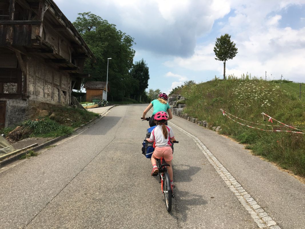 Nach einer ruhigen Nacht im Zelt, einem feinen Frühstück und toller Gemeinschaft starteten wir mit einer rasanten Abfahrt hinunter nach Solothurn zur 2.Etappe unserer Tour. Der Himmel wolkenlos und blau, die Sonnenblumenfelder leuchteten gelb und auf wechselnden Strassenunterlage (Schotter, Asphalt) folgten wir oft hautnah der Aare. Dazwischen folgten immer mal wieder schöne Bauernhöfe oder kleine Dörfer so z.B. das europäische Storchendorf Altreu. Dutzende frei lebende Störche konnten wir z.B. beim Ueberfliegen der Gegend, auf den Dächern der Bauernhöfe oder auf den Bäumen beobachten. Ein sehr eindrücklicher Ort. Nur wenige Minuten später konnten wir etliche startende Kleinflugzeuge des Flughafens Grenchen bestaunen, bevor es dann der Fahrradweg wieder zurück an die Aare führte. Eine erste Pause machten wir dann bei der sehr schönen Aarenholzbrücke bei Büren. Beim Brunnen konnten wir unsere Getränkeflaschen auffüllen, Hände und Gesicht kühlen und im Schatten der Bäume etwas kleines Essen und Trinken. In Nidau, wo die Aare in den Bielersee mündet, assen wir dann im Strandbad-Restaurant unser Mittagessen und mussten uns etwas zurückhalten, nicht gleich hier den Nachmittag zu verbringen, schliesslich hatten wir ja bis zum heutigen Ziel in Erlach noch ein paar Kilometer vor uns. Auf der westlichen Uferseite fuhren wir via Kraftwerk Hagneck, allgemein mit eher wenig Seeblick südwärts bis nach Erlach. Gegen 15.00 Uhr erreichten wir nach fast 50 km den grossen Campingplatz der Gemeinde Erlach und mussten erfahren, dass dieser vollständig ausgebucht ist. Damit hatten wir nun wirklich nicht gerechnet, trotz Ferienzeit. Die Konsequenz für die weitere Tour war, dass wir ab nun jeden Campingplatz am Tag davor telefonisch um Platzreservation bitten. Glücklicherweise hatte es hier mehrere Campingplätze, so dass wir beim Campingplatz mon Plaisir, ebenfalls direkt am See, noch ein Plätzchen fanden. Es dauerte nicht lange, da waren wir alle im wunderbar kühlenden Bielersee am Baden. Eine wahre Wohltat! Gegen Abend gewitterte es dann über dem Jura, über uns reichte es für etwas Regen. Gegen 20.45 Uhr machten wir dann schliesslich noch einen kleinen Spaziergang hoch zum Schloss bzw. zur Altstadt von Erlach. Direkt beim Schloss konnten die Kids auf dem kleinen, dafür ruhigen Spielplatz noch etwas spielen. Wie bzw. wohin es morgen weitergeht sind wir noch nicht ganz schlüssig, dies gilt es noch zu planen. Jedenfalls war auch die heutige Etappe entlang der Veloroute 5 bzw. 8 wieder sehr schön.