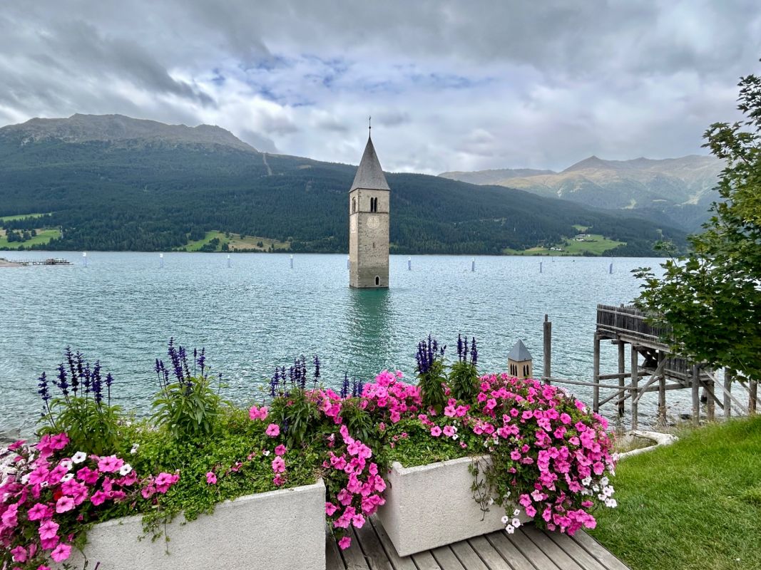 Der versunkene Kirchturm ist das Wahrzeichen des Vinschgau. 1950 wurde das Gebiet zugunsten des Reschensees geflutet.