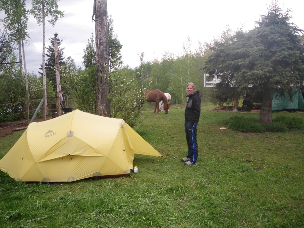 Trotz Ruhetag starteten wir am 26.Mai noch immer mit leicht schweren Beinen Richtung Süd-Ost ins 64 km entfernte Houston. Bereits um 13.00 Uhr hatten wir die leicht hügelige Route geschafft und überquerten dabei langsam aber stetig ansteigend den vorerst höchsten Punkt der Tour, den „Hungry Hill“ auf 844 m.ü.M. Wie auch das wechselhafte Wetter mit etwa 15 Grad war auch die Route mit Ausnahme einiger Farmbetrieben eher unspektakulär. Am nächsten Tag verabschiedeten wir uns nun definitiv vom Küstengebirge und nachdem wir bei Topley den nächsten kurzen aber knackigen Aufstieg zum „Six Miles Hill“ (840 m.ü.M.) geschafft hatten, fuhren wir (weiterhin bei Gegenwind) auf der Ebene des Interior Plateaus entlang Feldern und durch Waldgebiete bis nach Burns Lake. Vom See sahen wir allerdings kaum etwas, da er fast ständig durch Bäume bedeckt war. Da wir den auf der Karte eingezeichneten Campingplatz irgendwie verpassten und eine Fahrt retour nicht in Frage kam, entschieden wir uns irgendwo bei einem Haus zu übernachten. So fuhren wir an einigen Häusern vorbei und sprachen die ersten Personen die wir sahen an. Gleich beim ersten Versuch wurden wir von Ken und Angie Murray, mit Kind, 2 Hunden, 1 Katze und 2 Pferden im Garten herzlich aufgenommen und sogar spontan zum Abendessen eingeladen. Wir erfuhren auch, dass hier noch 1 Woche zuvor Schnee lag und wir wohl deswegen noch von der sonst üblichen Mückenplage verschont geblieben sind. Vor dem Schlafen brachte uns Ken sogar noch Popcorn ins Zelt, welche wir sofort genüsslich verschlungen. Am nächsten Morgen drückte uns Ken noch ein christliches Heft in die Hände, so stellte sich heraus, dass auch sie Christen sind... Am Folgetag hatten wir uns eigentlich eine lange Strecke über 130 km nach Vanderhoof zum Ziel gesetzt. Doch der Wind war einfach zu kräfteraubend, kurze knackige Hügel allgegenwärtig, so dass wir uns entschieden, etwa 7 km nach Fraser Lake an einem sehr schön gelegenen Campingplatz direkt am See zwischen Eisenbahn und Highway zu übernachten. Wie schon am Tag zuvor erzählte man uns wir wieder von jungen Schwarzbären mit Jungen, welche auf der Strasse bzw. auf dem Golfplatz gesichtet wurden. Wir sahen jedoch ausser einem Reh und Fuchs keine weiteren Wildtiere. Am Abend hatten wir dann noch etwas zu feiern: Mit zwei riesigen köstlichen Würsten auf dem Grill blickten wir auf die ersten 1000km unserer Tour zurück.