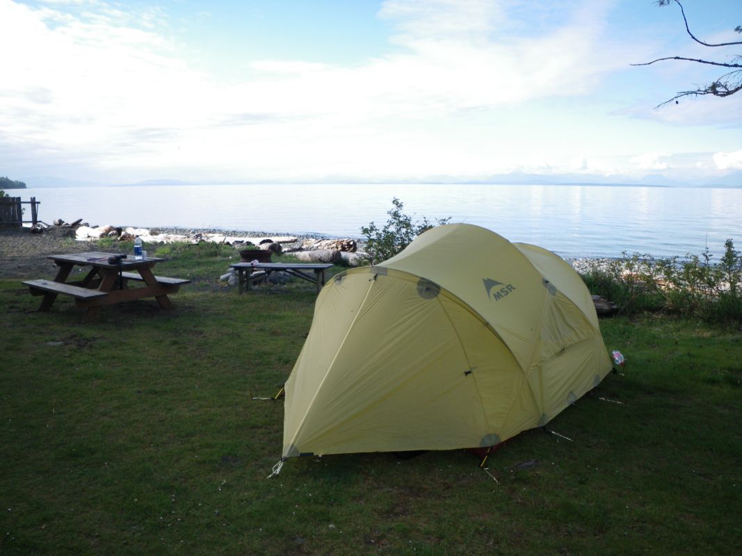 Die Tour beginnt: Am 11.Mai wachte ich dann mit einer starken Erkältung auf (Flug? Hotel?), trotzdem starteten wir zu unserer ersten Route Richtung Vancouver Island. Das Wetter war leicht bedeckt, aber trocken bei ca.12 Grad morgens bzw. ca. 18 Grad nachmittags. Von Vancouver Downtown fuhren wir durch den Standley Park bis Horseshoe Bay zur Fähre. Dort mussten wir leider eine mehrere km lange Zusatzschlaufe machen, da wir anstatt den Fussgängerweg via Dorf dem signalisierten Autoverlade-Verkehr folgten. Entsprechend später als geplant nahmen wir dann um 12.30 Uhr Fähre nach Nanaimo (Vancouver Island) und genossen während der 90min Reise die Sicht auf die herrlich verschneiten Berge der Coast Mountains. Auf dem rege befahrenen Highway (19) fuhren wir auf dem breiten Velostreifen durch Wälder und wieder häufig mit schönem Blick auf verschneite Berge zur Linken bis nach Parksville. In einem dieser Waldabschnitte durchquerten sogar Wildhasen und Rehe unsere Wege. Auch 2 Adler beobachteten wir kurz, als sie sich gerade an einem toten Reh am Strassenrand bedienten. Unsere 1.Nacht im neuen Zelt verbrachten wir in einem sehr einfachen Provincial Park Campground direkt am Pacific. Am nächsten Morgen starteten wir um 08.00 Uhr ab Parksville weiter nordwärts entlang des Pacifics, vorbei an etlichen Golfplaetzen, an schroffen Felsküsten und feinen Sandstränden vorbei, aber auch wieder durch Waldgebiete und diesmal sogar bei herrlichem Sonnenschein. Da wir zudem auf den Island-Highway 19A (Oceanside Highway) wechselten, war der Verkehr nun bedeutend geringer. Auch am 2.Fahrtag hatten wir kaum nennenswerte Steigungen zu bewältigen, so dass wir die 95 km nach Bates Beach bereits gegen 15.30 Uhr geschafft hatten. Der erneut schlichte Campground im Kitty Colemann Provincial Park (13 Dollars/Nacht) bot nur ein einfaches WC (Hütte mit WC-Papier) und eine Wasserpumpe (ohne Behandlung nicht trinkbar), sonst aber sehr schön gelegen am Waldrand direkt am Pacific. Erneut konnten wir unser Zelt ca. 10 m weg vom Meer an einer einfachen Feuerstelle aufstellen. Den ursprünglich geplanten Ruhetag erweiterten wir aufgrund einer nun auch bei Rebi aufgetretenen sehr starken Erkältung sowie Knieschmerzen auf 3 Erholungs- bzw. Genesungstage. Direkt am Pacific und mit Blick auf die entfernten Berge des Festlands gönnten wir unserem Körper die notwendige Ruhe, sahen erstmals Seelöwen und entdeckten bei Ebbe zwischen den Steinen grosse Muscheln, Seesterne und sogar einen Tintenfisch. Mehrfach flogen Weisskopf-Adler über unsere Köpfe hinweg und zweimal beschenkten uns sogar Fischer bzw. der „Campground Care Taker“ mit einem riesigen Fisch (davon 1 Lachs), welchen wir am Abend genüsslich auf unserem Feuer grillierten. Bei so viel Fürsorge, tollem Wetter und herrlichen Sonnenauf- und Untergängen konnten wir so am 16.Mai gestärkt die Tour fortsetzen. Ab Bates Beach folgten wir weiter dem Highway 19A zwischen dem Pacific und den verschneiten 2000er Gebirgen im Westen bis nach Campell River.