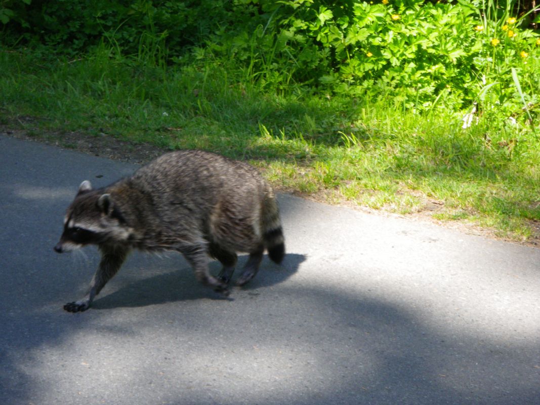 Ankunft in Vancouver: In Vancouver genehmigten wir uns dann zunächst mal 2 Erholungstage, welche wir zum Akklimatisieren, Zelt kaufen (zu unserem Enttäuschung fanden wir keine Tunnelzelte) und für etwas Sightseeing nützten. Bei einer Rundtour um den bekannten Standley Park durften wir nebst einigen Totempfaehlen auch viele Vogelarten und sogar einige Waschbären bewundern. Ein Waschbär wurde beim Passieren des Weges sogar beinahe von einem Skater überfahren, als er sich während mehreren Metern zwischen die rollenden Beine des Skaters wagte. Ein herrlicher Anblick... Nachdem wir an einem kleinen Sandstrand einige Sonnenstrahlen aufgetankt hatten und zum Rückweg ansetzten, wurde mein Fahrrad plötzlich wacklig und „pffffff“, mein Reifen platt! Etwas ungläubig nahm ich zur Kenntnis, dass mein neuer super Schwalbe Marathon Plus Reifen bereits vor dem eigentlichen Tourbeginn einen ersten Schaden erlitten hatte.