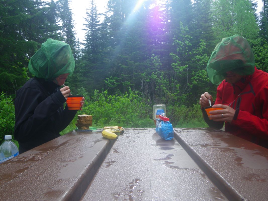 An diesem Tag begann es bereits nach wenigen km wie aus Kübeln zu regnen. Erstmals seit unserer Ankunft in Nordamerika wirklich sehr lange und überaus stark! Im Wissen, dass die nächsten 145 km bis Mc Bride durch eine einsame Wildnis führen und entsprechend nur Ressourcen der Mutter Natur zur Verfügung stehen werden, wollten wir an diesem Tag eine möglichst grosse Distanz bewältigen. Doch in Anbetracht des strömenden Regens und der kühlen Temperaturen war an eine sinnvolle Verschnaufspause nicht zu denken, da wir sonst sofort gefroren hätten. So entschieden wir uns, bloss 65km bis zum Purden Lake zu fahren und dort auf dem Campingplatz den Fahrtag zu beenden. Die Route war wohl auch wetterbedingt wenig aufregend, jedoch sahen wir immerhin unseren ersten Elch; allerdings tot und im Graben liegend... Im wie so oft im Wald liegenden Campingplatz flüchteten wir dann aufgrund des anhaltenden Regens erst mal ins Zelt und kamen erst mit den ersten Aufhellungen zum Kochen und Essen wieder heraus. Durch den dichten Waldabschnitt spazierten wir zur überdachten Picknick Area direkt am See, assen unsere Spaghettis und genossen zusammen mit einem Eichhörnchen noch die ersten Sonnenstrahlen des Tages. Als wir am nächsten Morgen aus dem Zelt krochen, wurden wir gleich von überaus hartnäckigen Moskitos attackiert, so dass an normales Frühstücken am Tisch eigentlich gar nicht zu denken war. Doch dies war unsere Chance, endlich mal den extra gekauften grünen Moskito-Gesichtsschutz anzuwenden. So trotzten wir den Angriffen und obwohl es nicht wirklich gemütlich war, so hatten wir es aufgrund unseres doofen Aussehens wenigstens lustig... Wir starteten bei wieder beginnendem leichten Regen und fuhren schon nach wenigen km an einem weiteren Campingplatz (mit Essen im Angebot!) vorbei. Wenn wir das gestern gewusst hätten.... Die Route wurde glücklicherweise wieder etwas lebendiger, mehr Kurven, häufige Steigungen mit anschliessender Abfahrt zum nächsten Flussübergang. Der morgendliche Regen hörte auf, wich jedoch gegen Mittag in einen noch weniger angenehmen Gegenwind. Doch unsere Gemüter erhellten sofort wieder, als wir den ersten (lebendigen) Elch am Strassenrand sahen und die schönen Cariboo Mountains ins Blickfeld rückten. Irgendwo bei den Ortschaften Loos (ein paar Häuser ohne Einkaufsmöglichkeiten) bzw. Crescent Spur (abseits der Route) entdeckten wir eine Tafel mit dem Hinweis auf eine Lodge. Da wir nicht genau wussten, wann ein nächster Campingplatz kommen würde (Anmerkung: wenige km später gibt’s einen...), nahmen wir zusammen mit einen eben angetroffenen Holländer die 3 km lange holprige Abfahrt auf uns und wir wurden nicht enttäuscht: Mitten in einsamer Natur, umgeben von einzelnen Bäumen und mit Blick auf die Cariboo Mountains fanden wir einige kleine, charmante Holzhütten (mit toller Innenausstattung und Kochgelegenheit) vor. So genossen wir den die Zeit in „unserem Chalet“ (125 Dollars/Nacht), genossen als Vorspeise eine feine Fertig-Pizza welche uns der Besitzer spendierte und fanden Zeit, wieder mal unsere dreckigen Fahrräder und Taschen auf Vordermann zu bringen. Am 03. Juni machten wir uns also auf in das noch 50 km entfernte Mc Bride. Während des kurzen Aufstiegs gleich zu Beginn begegneten wir wieder mal einem Schwarzbären und endlich klappte es mal mit einem Foto. Es folgte ein langer Downhill, wieder ein längerer Aufstieg um dann wieder hinunter nach Mc Bride zu fahren, welches etwa 700 m.ü.M. liegt. Hier machten wir Halt und genossen noch einen kleinen Spaziergang zu einem kleinen Wasserfall. Die Nacht war dann bei ca. 5 Grad (anfangs Juni..!) recht kalt, doch bis auf das Gesicht vollständig im Schlafsack eingemummt schliefen wir trotzdem recht gut.