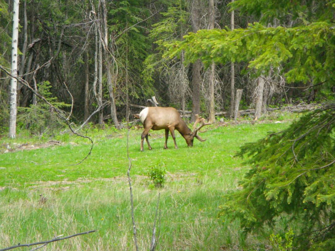 Zurück auf dem Festland Kanadas, erlebten wir am nächsten Morgen den ersten von vielen Tourtagen auf dem bekannten Yellowhead Highway Nr. 16. Diese Strasse beginnt hier am Pacific in Prince Rupert und endet erst nach über 2500km (!) im entfernten Winnipeg (Manitoba). Mit leichtem Rückenwind fuhren wir in wunderschöner und überaus einsamer Umgebung durch das Tal des (breiten) Skeena. Wir staunten dann allerdings, als auch noch nach über 50 km kaum Fahrzeuge und sogar kein einziges Gebäude in Sichtweite war. Dafür ein Reh... Erst gegen 15.30 Uhr und gefahrenen 90 km entdeckten wir gerade noch vor dem Exchamsiks River Provincial Park das erste (!) Gebäude, welches sich zu unserer Ueberraschung sogar als Campingplatz (18 Dollars/Nacht) mit kleinem Restaurant entpuppte. Dankend nahmen wir diese für uns unerwartete Uebernachtungsmöglichkeit an und machten dort gleich Bekanntschaft mit Doug & Gala Sly, einem anderen Biker-Paar aus Nelson, Kanada (http://www.crazyguyonabike.com/dsly). Sie sind ebenfalls leidenschaftliche Fahrradfahrer und sind mit einem Tandem Richtung Norden ins Yukon Territory unterwegs. Auf ihre Erfahrungen mit Bären angesprochen empfahlen Sie uns den Kauf eines (lauten) Air-Horns um wenn nötig die Bären von der Strasse zu verscheuchen.
