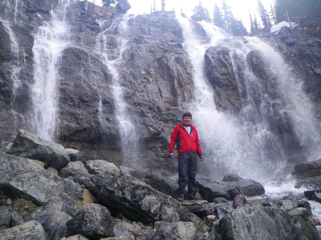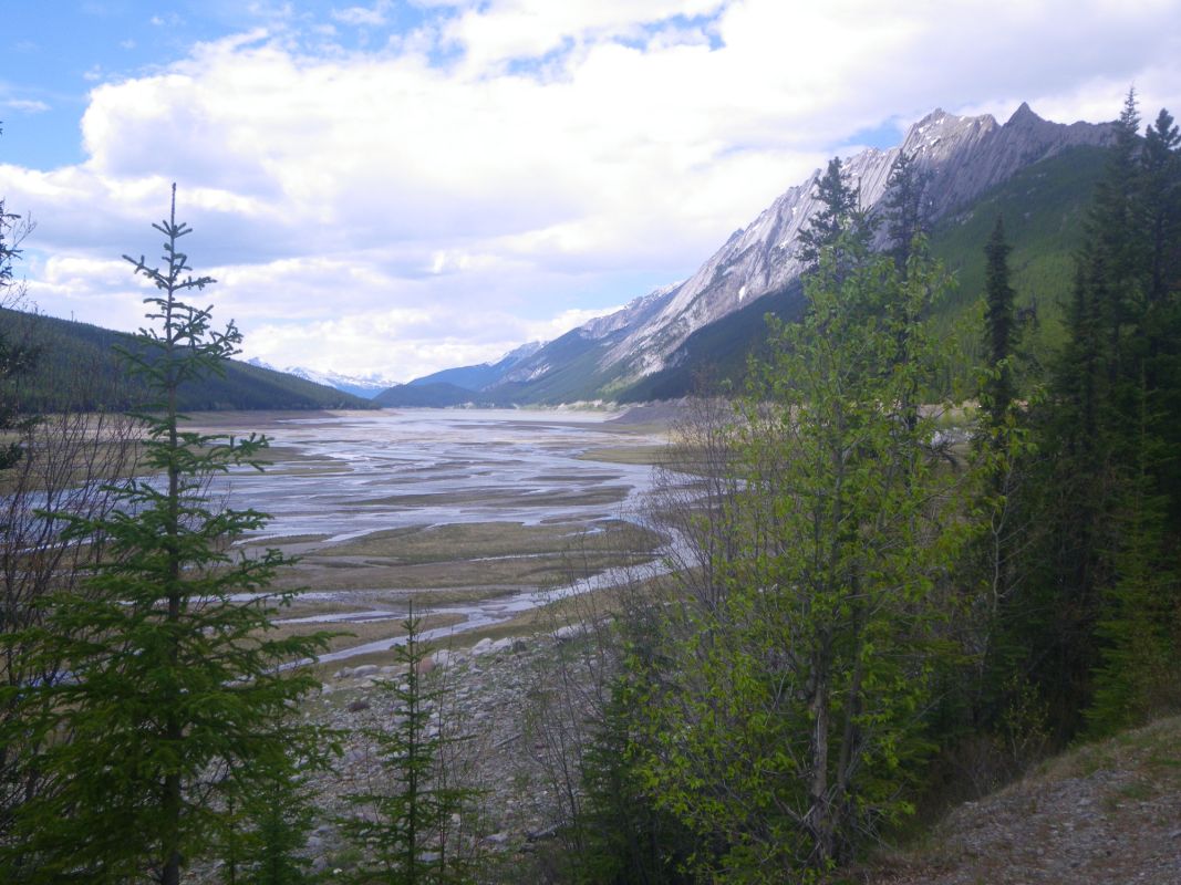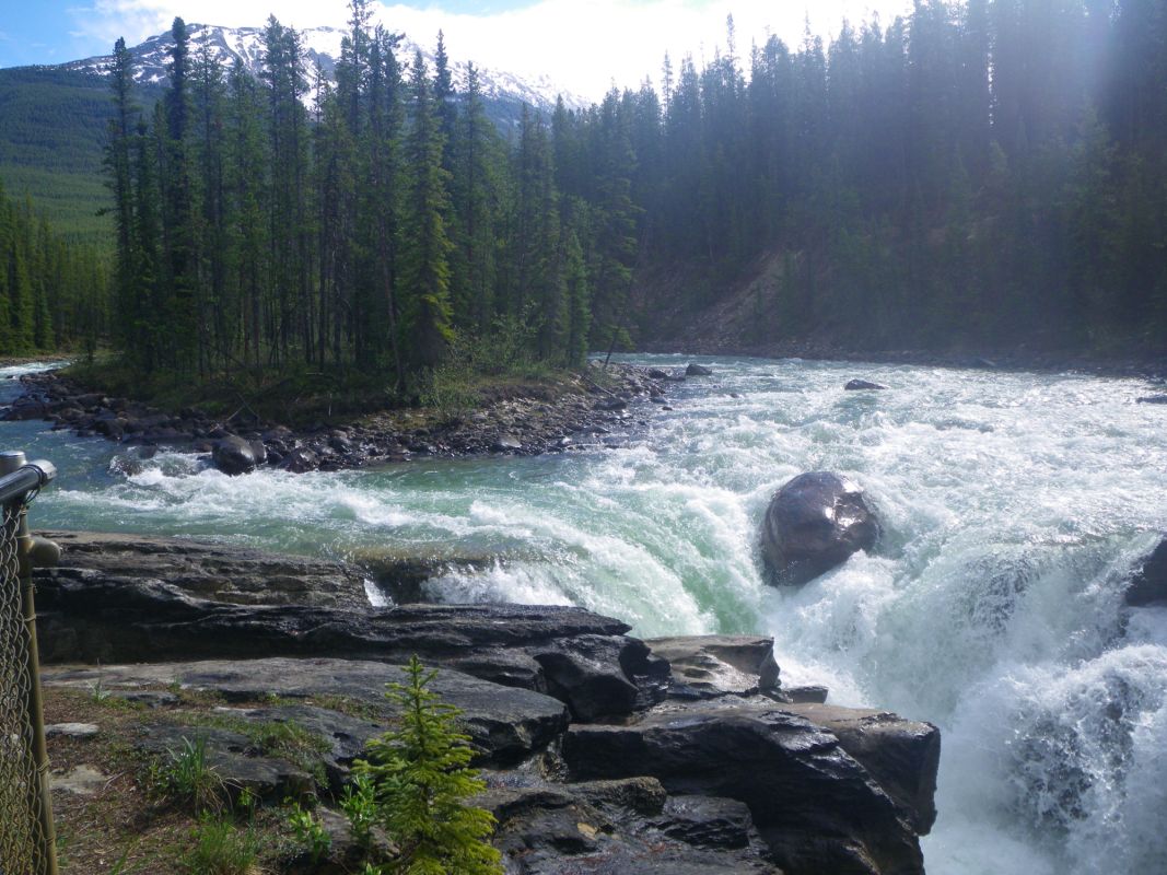 Am Montag Morgen starteten wir also trotz den sehr schlechten Wetterprognosen von 5 Tage Regen zur viel gerühmten Panoramastrasse von 230 km entlang des Hauptkamms der Rocky Mountains von Jasper nach Lake Louise. Im Wissen um die sehr raren Einkaufsmöglichkeiten (4 Restaurants mit je kleinem Shop) kauften wir in Jasper (ca. 1000 m.ü.M.) nochmals tüchtig Proviant ein: Spaghetti, 2 Brote, Snacks, 6 Liter Getränke und natürlich Bananen. Benzin zum Kochen hatten wir noch. So fuhren wir trotz leichtem Nieselregen mit viel Vorfreude auf die bevorstehenden Landschaften los. Die Route begann zunächst unspektakulär, doch schon nach 20 km erreichten wir mit den Athabasca Falls (Wasserfall) die erste Sehenswürdigkeit. Danach begann eine kontinuierliche Steigung und als der frühmorgendliche Regen aufhörte, wurde auch die ganze Landschaft nun eindrücklicher. Wir fuhren in einsamer Umgebung entlang des Athabasca Rivers zu unserem Ziel-Campingplatz am Honeymoon Lake. Doch zu unserer grossen Ueberraschung war dieser Campingplatz noch geschlossen, dies am 07.Juni... Wir stiessen unsere Fahrräder an den Barrieren vorbei und trafen auf ein Waldstück direkt am See mit einer offenen Holzbaracke, worin wir sogar zwei Oefen vorfanden. Unser Entschied, hier zu übernachten war gefallen... Nebst viel Feuerholz fanden wir auf einem Platz Bärenkot, was uns auch in Anbetracht der erwarteten kalten Nacht dazu bewog, unser Zelt innerhalb der Baracke neben dem Ofen aufzustellen. So feuerten wir kräftig an und erhofften uns damit eine etwas wärmere Nacht. Gemütlich war es allemal... Nachdem wir zum Dessert noch eine Schoggi-Banane machten, gingen wir schlafen und vernahmen nur noch im Halbschlaf, wie während der Nacht heftiger Regen auf das Barackendach niederprasselte.