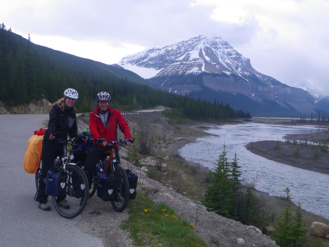 Gestärkt mit einem Frühstück im Restaurant mit Ei und Speck machten wir uns am nächsten Morgen auf, den ersten (!) Pass unserer Tour zu überwinden. Auf sehr schöner Route entlang von vielen Seen und Sümpfen und vorbei an gewaltigen Bergen wie z.B. dem Mt. Fitzwilliam gings bei leichtem Rückenwind mal leicht aufwärts, abwärts oder einfach geradeaus. Jedenfalls erreichten wir die Passhöhe des Yellowhead auf 1131 m.ü.M., ohne einen richtigen Passaufstieg wahrgenommen zu haben. Hier am Eingang des Jasper Nationalpark betraten wir neu die kanadische Provinz Alberta, was eine Zeitumstellung von + 1 Stunde sowie eine Eintrittsgebühr für den Nationalpark (Jahreskarte für alle Nationalparks zu 68 Dollars) zur Folge hatte. Gespannt auf die Landschaft und Tierwelt im Nationalpark fuhren wir passabwärts Richtung Jasper und schon nach wenigen km sahen wir tatsächlich die ersten Hirsche, die sich auch durch die fotographierenden Menschen kaum aus der Ruhe bringen liessen. Mit Jasper erreichten wir dann eine recht touristische Ortschaft, was uns zu Beginn nach den Wochen der Einsamkeit doch etwas irritierte. Am Sonntag morgen besuchten wir dann eine Kirche und nahmen mit weiteren 13 (!) Menschen am Gottesdienst teil. Den Nachmittag verbrachten wir dann mit einer Tour zum Maligne Lake. Mit einem Shuttle-Bus brachte man uns samt Fahrräder hinauf zum See. Den 50km langen, wunderschönen Rückweg nach Jasper (vorwiegend Downhill) machten wir dann mit dem Fahrrad und durften nebst dem Maligne Lake auch den tiefer gelegenen Medicine Lake sowie den Maligne Canyon bewundern. Während der Abfahrt entdeckten wir auch Widder (Dickhornschafe), Hirsche und Rehe nahe oder sogar auf den Strassen. So freuten wir uns umso mehr auf die kommenden Tage auf dem bekannten Icefields Parkway, da können die Wetterprognosen noch so schlecht sein...
