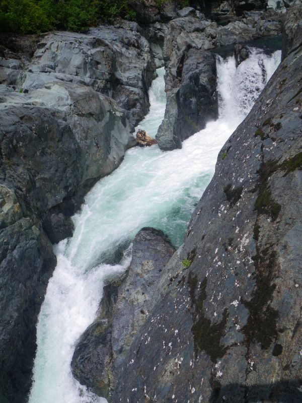 Der nächste Tag stand ganz im Zeichen des Manning Provincial Parks sowie dessen Pass, dem Allison Pass auf 1352 m.ü.M. In Erwartung eines erneut harten Aufstiegs gings kontinuierlich aber recht angenehm aufwärts, doch bevor wirs richtig realisierten, hatten wir die Passhöhe bereits erreicht. Es folgte eine sehr, sehr lange Abfahrt durch dichte Wälder, vorbei an vielen Bächen, kleinen Wasserfällen, farbig blühenden Wildblumen und erneut sahen wir 4 Rehe. Einzig die durch Schlaglöcher etwas holprige Strasse forderte bei diesem Tempo unsere Weitsicht. Kurz nach Mittag erreichten wir bei langsam wieder zunehmendem LKW-Verkehr mit einer weiteren Abfahrt auf 100 m.ü.M. die Kleinstadt Hope (ca. 6000 Einwohner), welche ich mir aufgrund der vielen Verkehrsknotenpunkte, der Eisenbahnverbindung und Nähe zu Vancouver eigentlich viel grösser vorstellte. So waren wir aber positiv überrascht, denn Hope liegt inmitten steiler Berge wunderschön am Zusammenfluss vom Fraser- und Coquihalla River. Unser Zelt schlugen wir nahe der Strasse am „Telte-Yet Camping“ mit entsprechend wunderschönem Blick auf den breiten Fraser River und die dahinter liegenden Berge auf.
