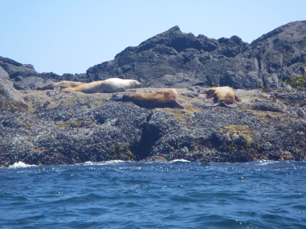Am Dienstag morgen starteten wir dann zum zweiten Mal Richtung Vancouver Island, diesmal jedoch mit dem Ziel Pacific Rim Nationalpark und der kleinen Ortschaft Tofino. Wir passierten dazu erneut Vancouver Downtown, fuhren wie schon 7 Wochen vorher ca. 30 km nordwärts nach Horseshoe Bay und nahmen dort die Fähre nach Nainamo auf Vancouver Island. Dort erlebten wir nochmals den (mittlerweile noch etwas intensiveren) regen doppelspurigen Verkehr auf dem Island Highway 19, bevor wir dann westwärts auf den Highway 4 wechseln konnten. Nach etwa 85 km stoppten wir dann nähe des Whiskey Creek im Little Qualicum Falls PP. Auf dem abendlichen Spaziergang führte uns ein kleiner Rundpfad zu einem wunderbaren, in seiner Form nicht ganz alltäglichen Wasserfall. Am nächsten Morgen überquerten wir den Port Alberni Summit auf 411m.ü.M. und während der Abfahrt hinunter nach Port Alberni auf Meereshöhe sprengten wir irgendwo inmitten der Bäume die 3000 km Marke on Tour in Kanada. Da Rebi seit den überaus starken Gegenwinden nach Osoyoos weiter an Knieschmerzen litt und die ganze Strecke zwischen Nainamo und Tofino eine „One-Way-Route“ ist , hätten wir uns gerne eine gemütliche Schiffsfahrt nach Ucluelet gegönnt. Doch weil dieses nur alle 2 Tage fährt und den Hafen bereits an jenem Morgen verlassen hatte, blieb uns noch die Variante mit dem Bus (Anbieter Tofino-Bus) gleich bis Tofino zu fahren. Wir hatten Glück, dass es bis max. 2 Fahrräder im Bus keine eigene Fahrradbox brauchte. So erlebten wir die sehr hügelige und kurvige Route von Port Alberni nach Tofino erst mal aus dem Bus heraus. Am 30.Juni (Mittwoch), also 1 Tag vor dem grossen Canada-Day und dem entsprechend verlängerten Wochenende erreichten wir Tofino und mussten sehr froh sein, dass wir für den (vorerst) neuen Spitzenpreis von 40 Dollars immerhin für die erste Nacht einen Camping Platz ergattern konnten. Ueber das Canada-Day Weekend war dieser Campingplatz nämlich seit Langem vollständig ausgebucht! Immerhin hatten wir riesigen Glück, dass es gleich neben an über dem Haag einen weiteren Campingplatz gab, welcher seine Zeltplätze nur auf der Basis „First come first serve“ vergab. Zum absoluten „Schocker-Preis“ von 62 Dollars (!!) pro Nacht inkl. Whirlpool schlugen wir in der Sehnsucht nach ein paar freien Tagen an diesem aber wirklich sehr schön gelegenen Platz mit Blick auf den Pacific zu. Die Tage in Tofino zeigten uns nochmals ein ganz anderes Landschaftsbild von Kanada. Riesige, fast leere Sandstrände auf dessen harten Sand man sogar Fahrradfahren konnte, wunderbar vorgelagerte Inseln, Regenwälder und natürlich der pazifische Ozean, in dessen Gebiet bei Tofino sich fast das ganze Jahr hindurch Grau- und Killerwale (Orcas) aufhalten. An der bekannten 30 km langen Long Beach trafen sich viele Surfer und lustige Gestalten als leben sie noch in den 1980 Jahren... Alte (verbeulte) VW Busse und Pickups mit Surfbrettern oder Kanus drauf säumten die Strassen und wir merkten schnell, dass man in Tofino alles ein bisschen ruhiger angeht. Hier auf dem Campingplatz trafen wir auch auf 2 nette Chilenen (Magarena & Pepe alias Jose), die uns mit ihrem Auto spontan zu ein paar entfernten (Regenwald, Long Beach etc.) fuhren und überhaupt hatten wir es immer sehr lustig zusammen. Ein weitere Höhepunkt erlebten wir beim Whale watching. Auf einem fast 3 stündigen Boots-Trip mitten durch die zerklüfteten Inseln konnten wir (entfernt) Grauwale und recht nahe viele Killerwale (Orcas) beobachten. Wow, was für ein Erlebnis...! Aber auch Adler, andere Vogelarten und Seelöwen konnten wir faul auf einer Inselgruppe liegend sehr gut erkennen. So genossen wir zusammen mit Magarena und Pepe drei wunderschöne Ruhetage mit dem einzigen Makel der kühlen Temperaturen (Wind!!) und der horrenden Campingpreise, die in meiner „Fahrrad-Karriere“ einen einsamen Rekord darstellen...