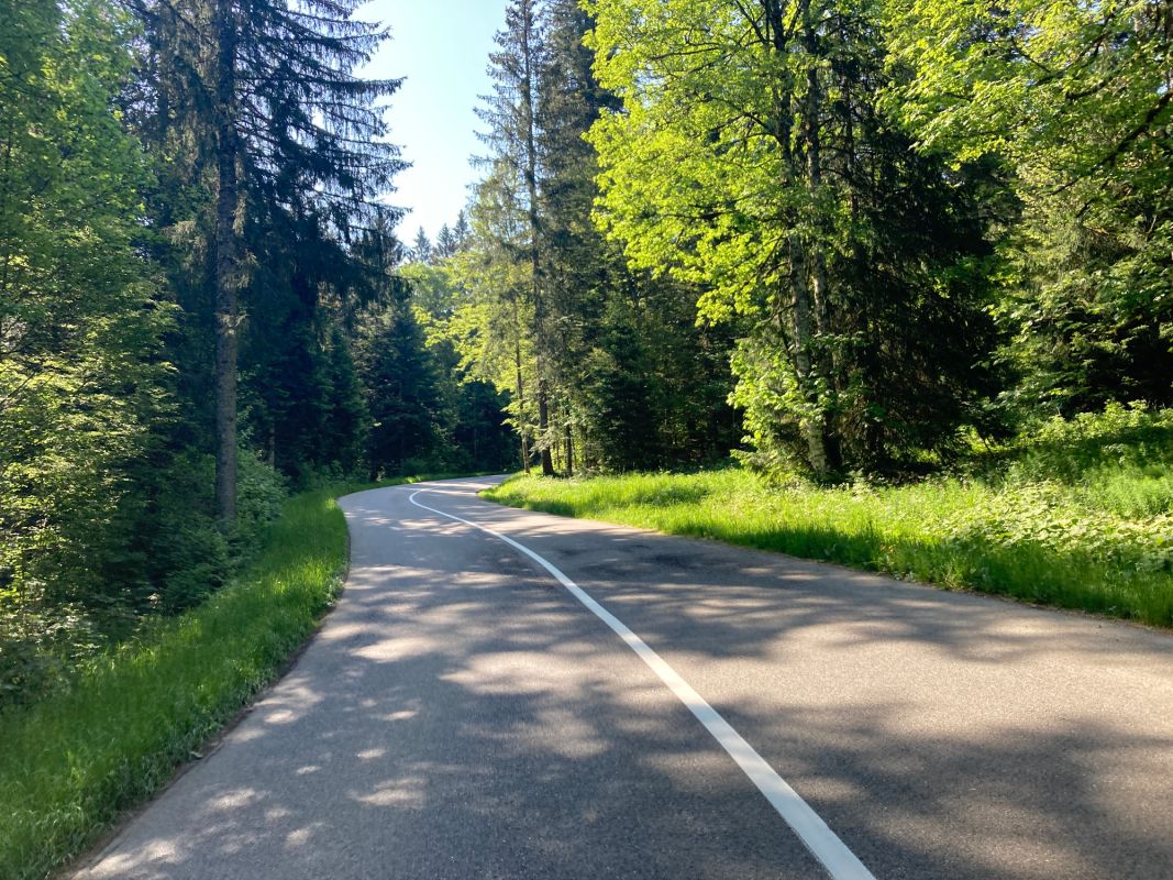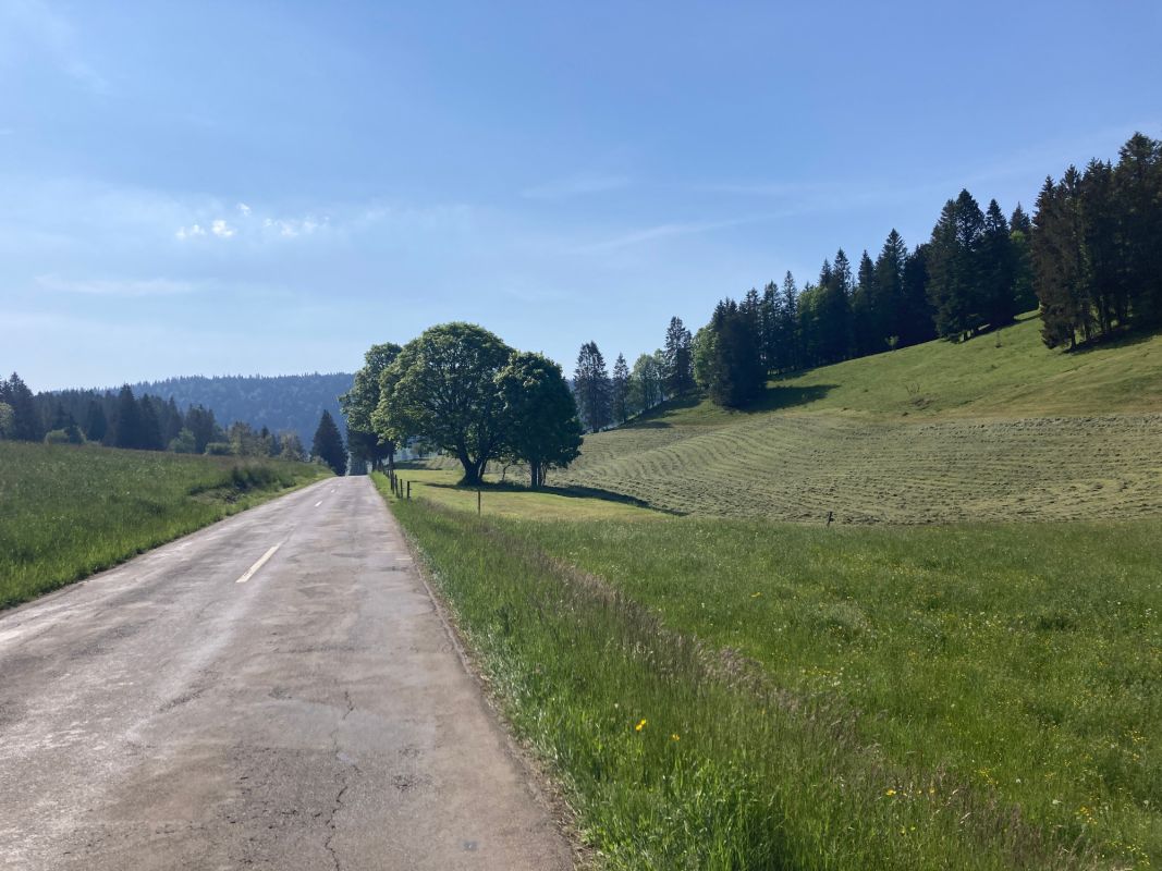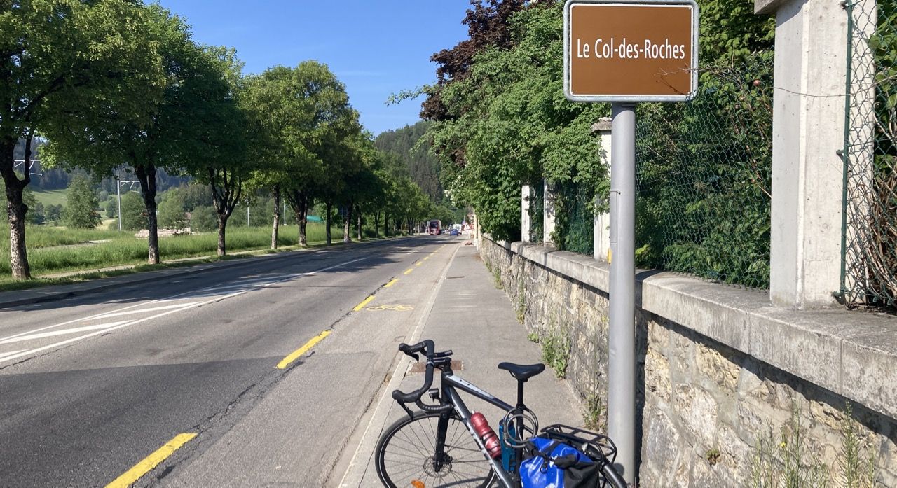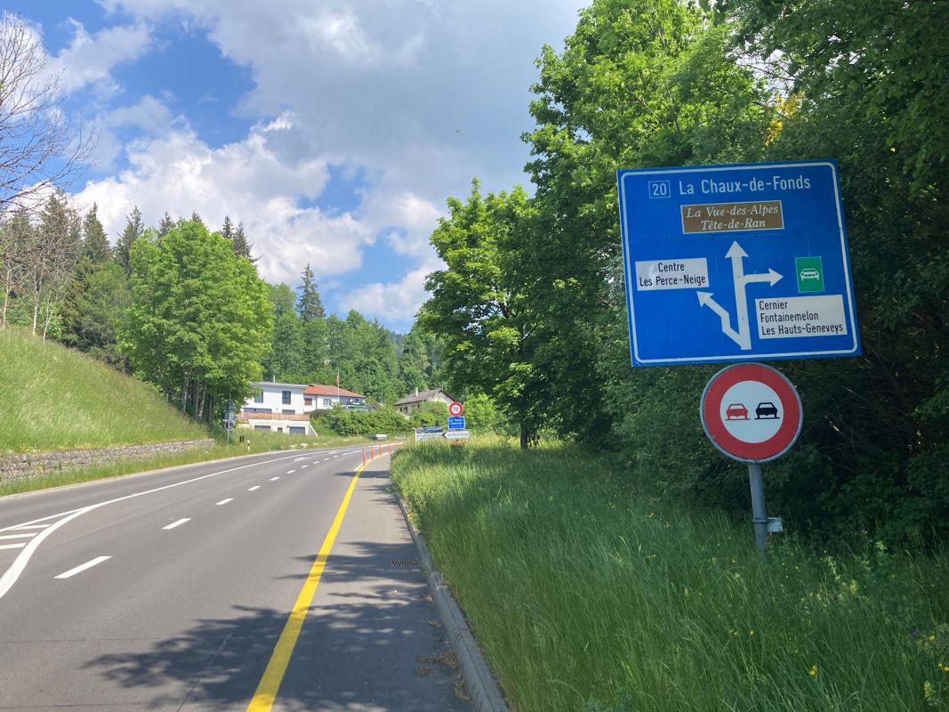 Nach einer Zugfahrt durch abgelegene schöne Jura-Höhen starte ich in der bekannten Uhrenstadt La-Chaux-de-Fonds auf 992 m.ü.M. zur Tagestour über die drei Pässe Col des Roches, Col de la Tourne sowie den Col de la Vue des Alpes im Kanton Neuenburg. Auf der Hauptverkehrsachse fahre ich vom Bahnhof durch die Stadt La-Chaux-de-Fonds und Le Locle steigungsfrei zum ca. 10 km entfernten Col des Roches. Ganz unscheinbar steht hier an der Hauptstrasse die Passbeschilderung und kurz danach folgt sogar eine Bahnhof-Haltestelle mit dem gleichnamigen Namen. Hier im nahen Grenzgebiet zu Frankreich beginnt dann der erste Anstieg inmitten schöner Natur. Verkehrsarm verläuft die schmale Strasse vorbei an bunten Wiesen, weidenden Kühen, Pferden & Schafen sowie durch schöne, schattenspendende Waldgebiete. Kleine Hochebenen ermöglichen dabei immer wieder Erholungsphasen. Ein Wanderwegweiser auf dem «Grande Joux» zeigt, dass ich mich hier bereits auf einer Höhe von 1171 m.ü.M. befinde, also sogar 1 m höher als der kommende Pass, doch zunächst folgt tatsächlich nochmals eine Abfahrt hinunter nach Les-Ponts-de-Martel bevor der finale Anstieg zum Pass kommt. Auf dem Col de la Tourne, welchen ich nach total ca. 1h 45 min erreiche, habe ich dann Sicht hinunter auf den Neuenburgersee. Auch während der Abfahrt geben die Bäume teilweise kurze Sicht zum See frei, aber die Sichtverhältnisse lassen nur wenig Fernsicht zu. In Boudevillier beginnt dann der letzte Anstieg auf den höchsten der drei Pässe. Knackig geht’s auf breiter Strasse immer in gleicher Richtung den Jurahügeln entlang aufwärts, die Szenerie verändert sich dabei auf den ca. 8 km kaum. Die vielen Beschilderungen zur "Vue des Alpes» schüren Erwartungen, die am heutigen Tag dann auf 1283 m.ü.M. mangels Fernsicht nicht ganz erfüllt werden können. Mit über 1000 Höhenmetern in den Beinen freue ich mich dann auf eine letzte Abfahrt hinunter nach La-Chaux-de-Fonds, wo die schöne Tour im Neuenburger Jura nach 54 km endet.