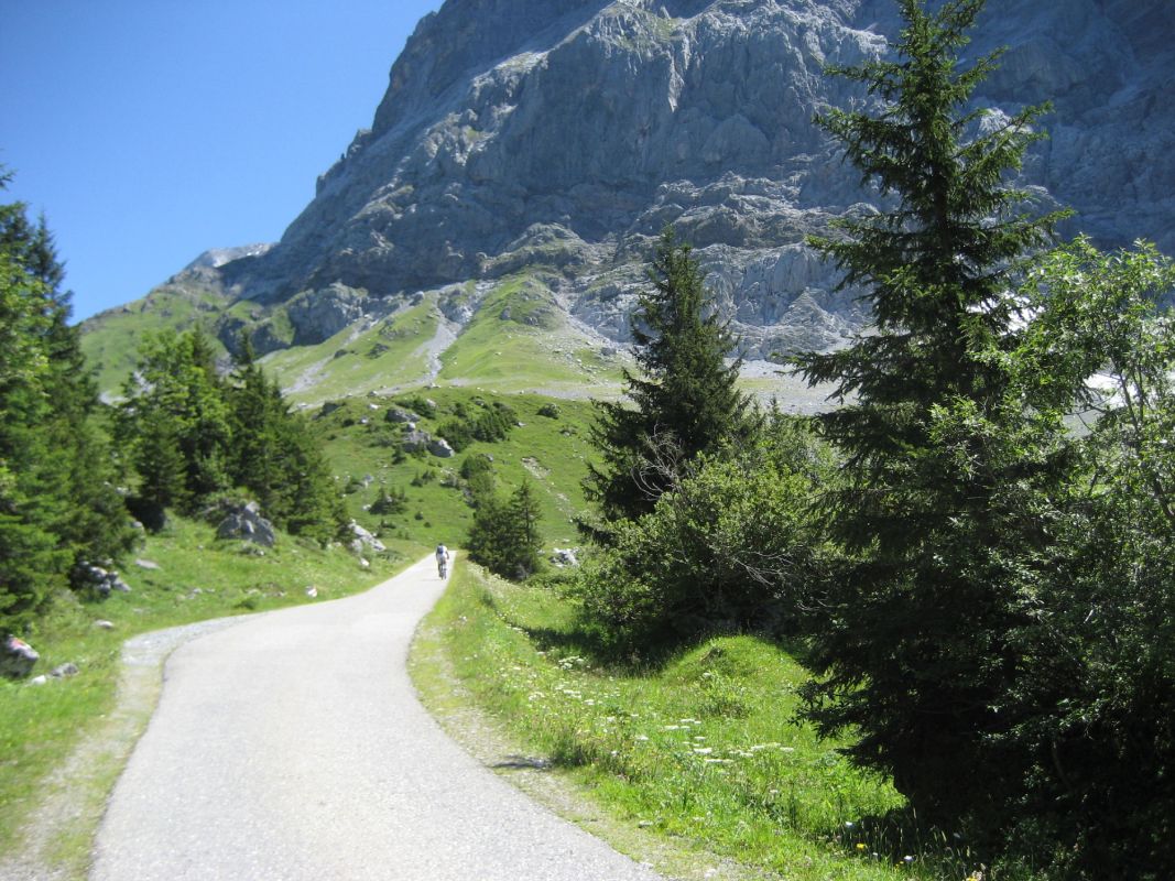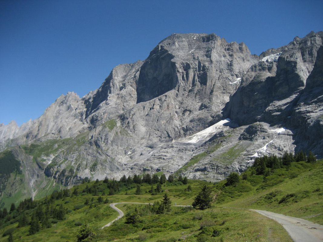Auf Grindelwaldner Seite bildet die Scheidegg den Abschluss des breiten Talkessels. Oben auf der Passhöhe wartet ein atemberaubendes Panorama mit Blick auf die umgebenden Felswände von Wetterhorn (3692 m.ü.M.), Schreckhorn ( 4078 m.ü.M.) und Eiger (3970 m.ü.M.). Auf der nördlichen Seite ist die Passhöhe nur durch das enge Reichenbachtal zu erreichen. Obwohl seit 1979 eine durchgehende Strassenverbindung über die Grosse Scheidegg besteht, ist der Pass für den Privatverkehr gesperrt. Auf der schmalen, einspurigen Strasse verkehren nur Postautos. Dies macht die Grosse Scheidegg zu einem beliebten Ziel für Radfahrer.