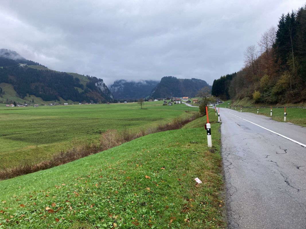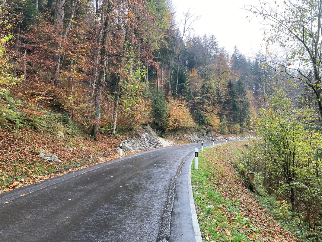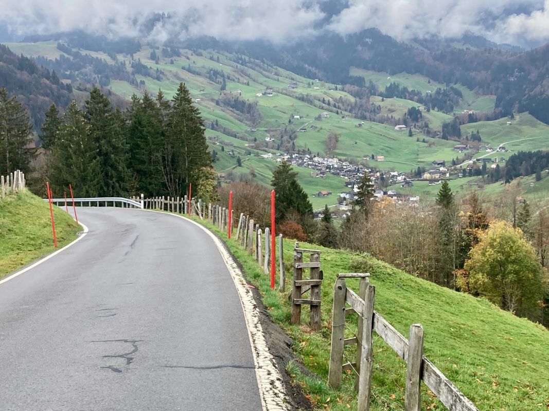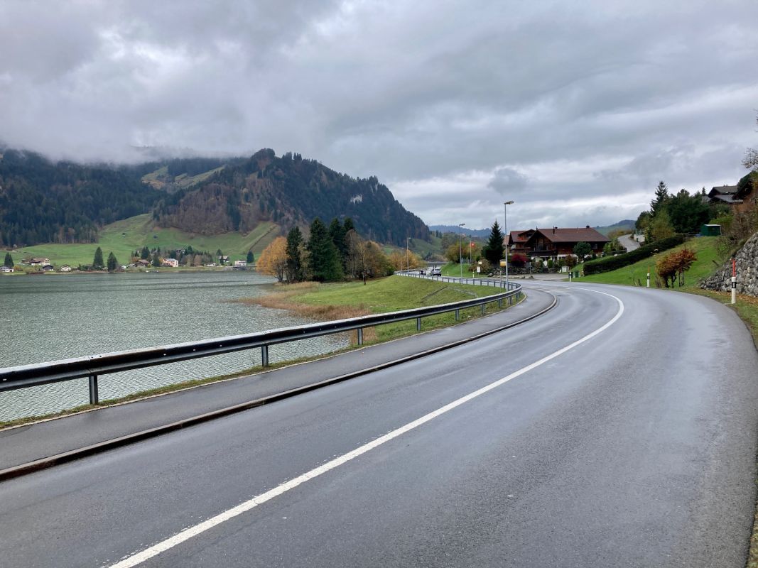 Vom Bahnhof in Schwyz gehts zunächst hinauf nach Schwyz (516 m.ü.M.) wo die ersten Wegweiser zur Ibergeregg zeigen. Ich entscheide mich dabei für die Autoroute und nicht für den offiziellen Fahrrradweg Nr. 76. Mit durchschnittlich knackigen 8% Steigung gehts auf schmalen Strassen und mit kaum Verkehr passaufwärts, wetterbedingt leider ohne Fernsicht (da waren die Wetterprognosen etwas ungenau...). Nach 13 km Länge und 958 Höhenmeter erreiche ich nach 90 min die Passhöhe der Ibergeregg auf 1406 m.ü.M. Vor und nach der Passhöhe sind einige kleinere Skigebiete bereits in den Vorbereitungen für den Winter, doch am heutigen 02.November liegt noch überhaupt kein Schnee. Die Abfahrt führt nach Oberiberg, Unteriberg bis hinunter zum Sihlsee auf 889 m.ü.M., dem flächenmässig grössten Stausee der Schweiz. Die Strecke führt nun schön entlang des Ostufers durch Euthal nach Willerzell, wo der Aufstieg zur Sattelegg beginnt. Auf einer Distanz von kaum 5 km gehts auf weiterhin kaum befahrener Strasse erneut knackig steil etwa 300 Höhenmeter aufwärts, bis man auf 1190 m.ü.M. die Passhöhe mit Restaurant erreicht. Von hier gehts dann aber rasant und oft sehr kurvenreich abwärts, im Verlauf durchquert man noch zwei Tunnels, bis man nach total 49 km und total 1269 Höhenmeter den Bahnhof Siebnen erreicht.