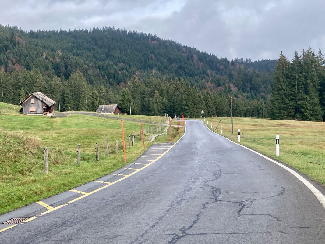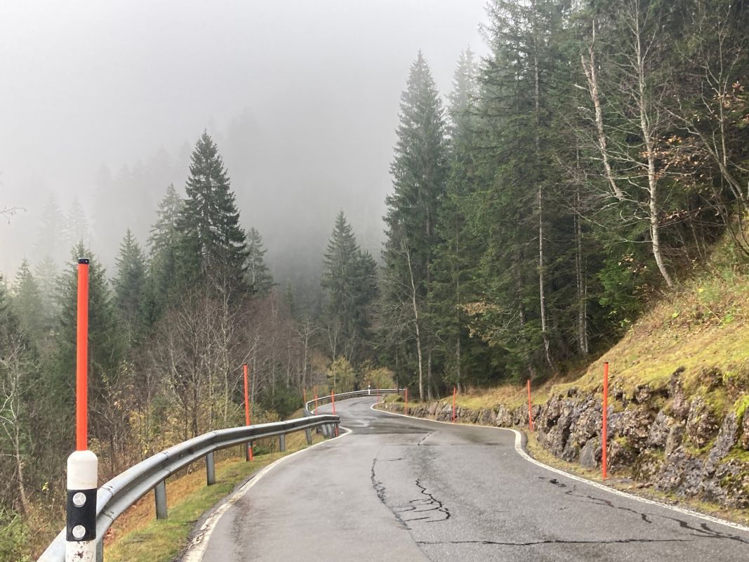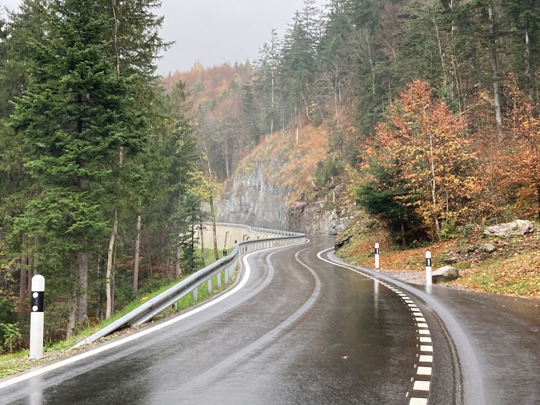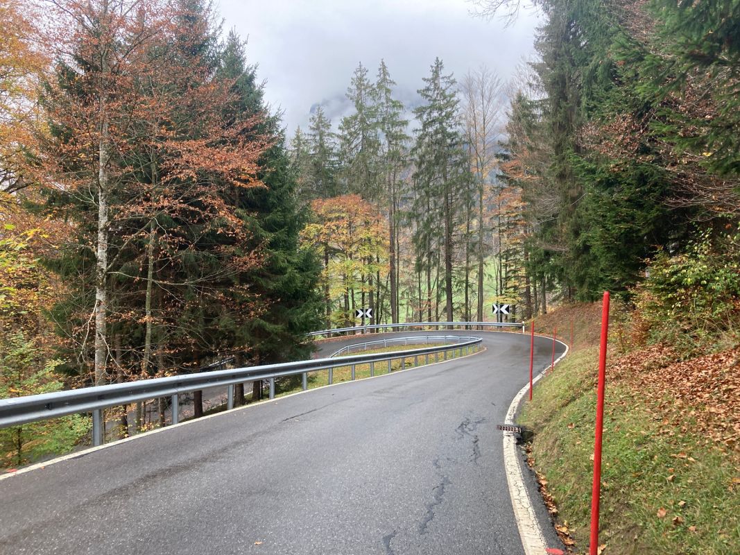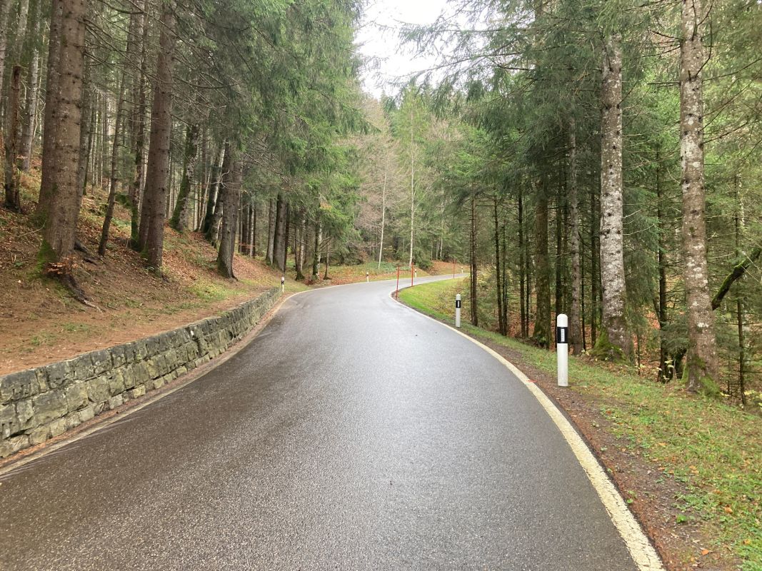 Vom Bahnhof in Schwyz gehts zunächst hinauf nach Schwyz (516 m.ü.M.) wo die ersten Wegweiser zur Ibergeregg zeigen. Ich entscheide mich dabei für die Autoroute und nicht für den offiziellen Fahrrradweg Nr. 76. Mit durchschnittlich knackigen 8% Steigung gehts auf schmalen Strassen und mit kaum Verkehr passaufwärts, wetterbedingt leider ohne Fernsicht (da waren die Wetterprognosen etwas ungenau...). Nach 13 km Länge und 958 Höhenmeter erreiche ich nach 90 min die Passhöhe der Ibergeregg auf 1406 m.ü.M. Vor und nach der Passhöhe sind einige kleinere Skigebiete bereits in den Vorbereitungen für den Winter, doch am heutigen 02.November liegt noch überhaupt kein Schnee. Die Abfahrt führt nach Oberiberg, Unteriberg bis hinunter zum Sihlsee auf 889 m.ü.M., dem flächenmässig grössten Stausee der Schweiz. Die Strecke führt nun schön entlang des Ostufers durch Euthal nach Willerzell, wo der Aufstieg zur Sattelegg beginnt. Auf einer Distanz von kaum 5 km gehts auf weiterhin kaum befahrener Strasse erneut knackig steil etwa 300 Höhenmeter aufwärts, bis man auf 1190 m.ü.M. die Passhöhe mit Restaurant erreicht. Von hier gehts dann aber rasant und oft sehr kurvenreich abwärts, im Verlauf durchquert man noch zwei Tunnels, bis man nach total 49 km und total 1269 Höhenmeter den Bahnhof Siebnen erreicht.