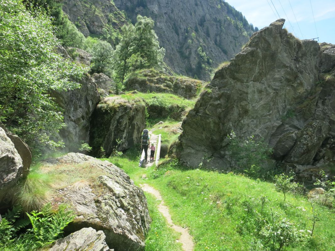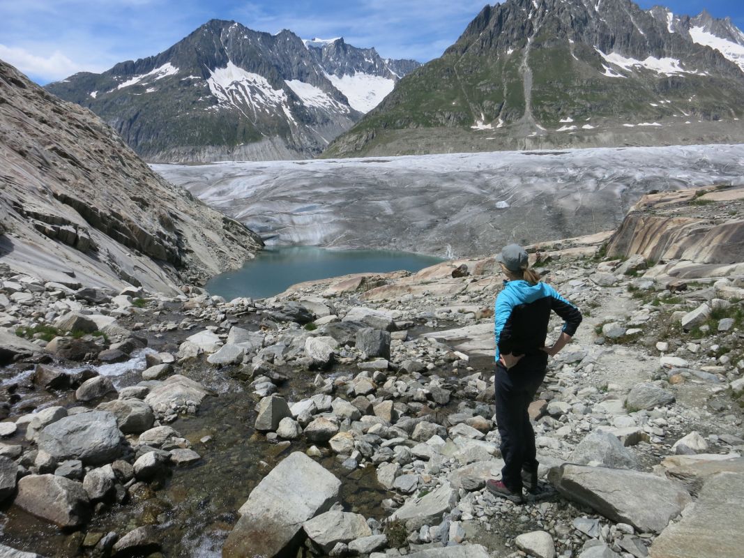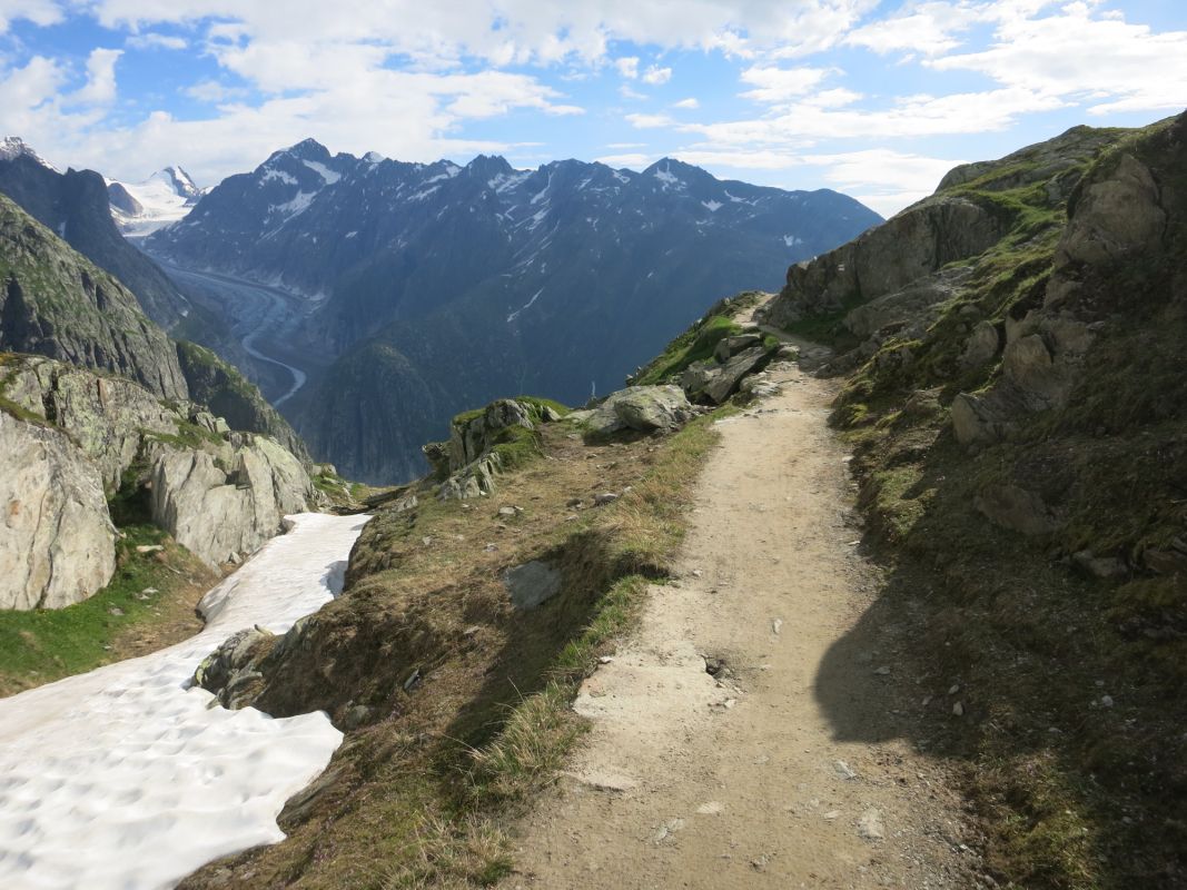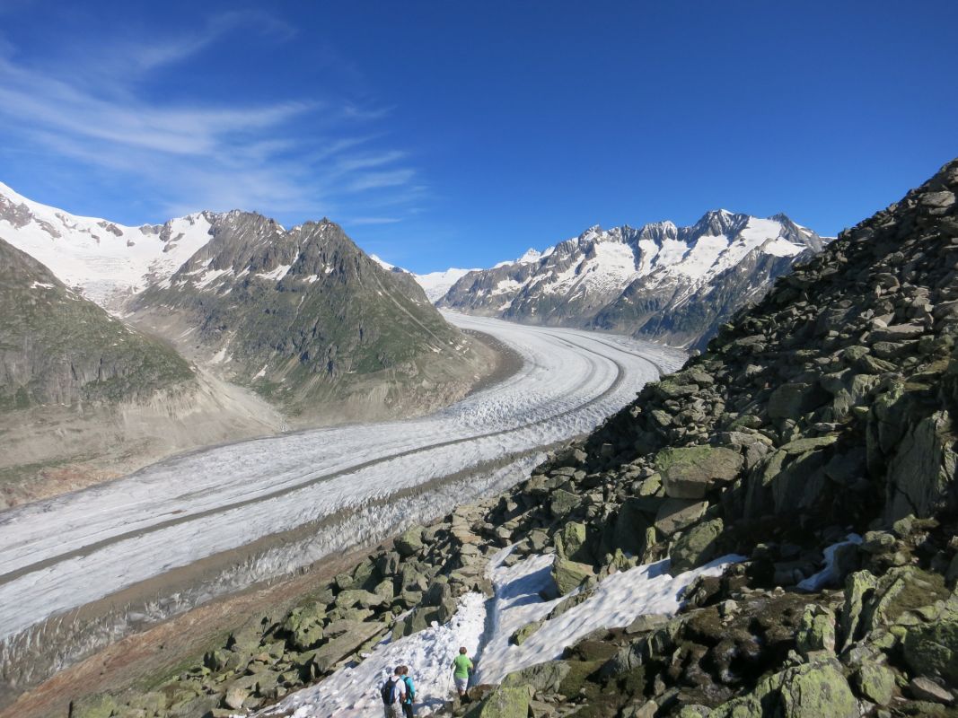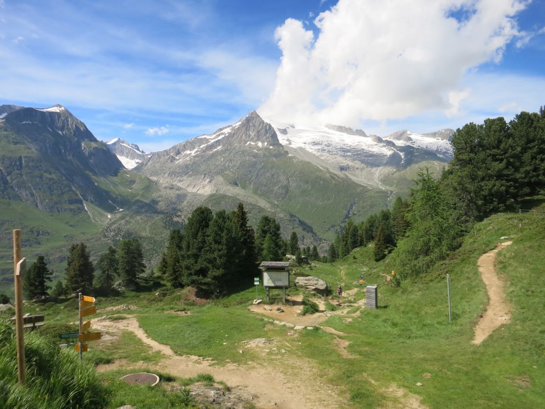 Unsere Familien-Trekkingtour 2016 sollte uns zum flächenmässig grössten und längsten Gletscher der Alpen führen; dem Aletschgletscher. Um das sonnige Wetter und die Umgebung so richtig geniessen zu können, habe wir die eigentlich gut in 2 Tagen machbare Route in eine 3 tägige Route verlängert, so dass wir zumindest einen Tag ohne längere (An bzw. Ab-) Reise geniessen können. Mit dem Zug & Postauto fuhren wir nach Blatten bei Naters (VS) - 1327 m.ü.M.) und von da an gings bald hinein und mehrheitlich aufwärts in einen schönen, spannenden Waldabschnitt. Anschliessend passierten wir hoch über der Massaschlucht einen schmalen Pfad, welcher uns entlang der steilen Felswand erneut hinein in einen lichten Wald und schliesslich zur Seilbahnstation Ried-Mörel (1189 m.ü.M.) führte. Die Seilbahn brachte uns dann hinauf zur Riederalp (1905 m.ü.M.) und nach einem ca. 20 min. Aufstieg erreichten wir beim Bergrestaurant Riederfurka unseren ersten Uebernachtungsplatz.