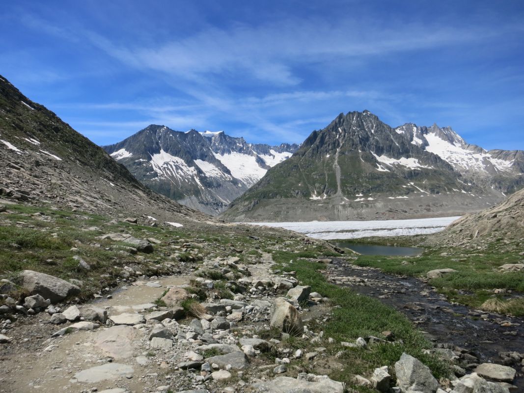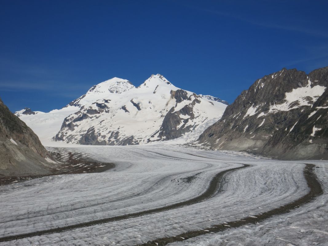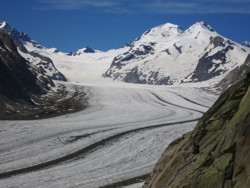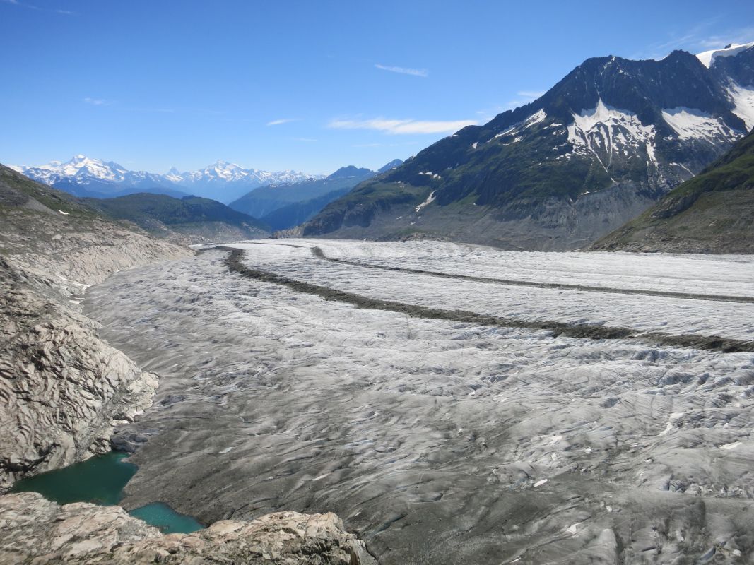 Am 2.Tag stand zunächst die Anreise zur Bettmeralp auf dem Programm. Nach dem kurzen Abstieg vom Hotel zurück zur Riederalp nahmen wir den kleinen Elektrobus (Shuttlebus) zur Gondelbahn auf die Bettmeralp. Diese führte uns dann hinauf zur Bergstation Bettmergrat auf (2647 m.ü.M.). Beim nahen Aussichtspunkt erblickten wir dann zum ersten mal diesen riesigen Aletschgletscher und waren einfach überwältigt von diesem Anblick! Gleich rechts dieser Aussichtsplattform begann schliesslich die Wanderung entlang dieses imposanten Gletscherstreifens. Auf schmalen Wegen, mal durch Geröllfelder, mal durch kleinere Schneefelder (man war gerade noch daran den letzten Schnee von den Wegen zu befreien) wanderten wir etwas erhöht oberhalb des Gletschers, im Sichtfeld nicht nur dieser unbeschreibliche Gletscher (mit Sicht bis zum Konkordiaplatz) sondern auch verschneite Berge, blauer Himmel... Einfach wunderbar! Bald erreichten wir dann die Ebene beim Märjelensee (2300 m.ü.M.), welche mit ihren riesiegen Felsplatten und Picknickmöglichkeiten nebst uns auch viele andere Wanderbegeisterte zum Pause machen und Mittagessen einlud. Bevor wir uns dann auf den kurzen Weg zu unseren zweiten Uebernachtungsort, die "Gletscherstube", machten, nahmen wir noch den Abstieg zum Gletscherrand auf uns und bestaunten dort am Rande des kleinen Sees die meterhohen Gletschermassen. Die Sonnenterrasse der Gletscherstube erreichten wir bereits am frühen Nachmittag, so dass ich nochmals eine zusätzliche kleine Wanderung (2 x ca. 20 min) zur "Platta" machte, wo man erneut einen wunderbaren Ausblick auf den Aletschgletscher geniessen kann.