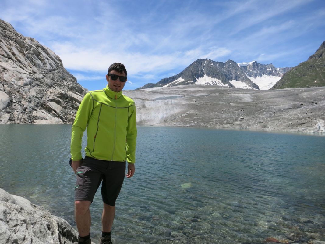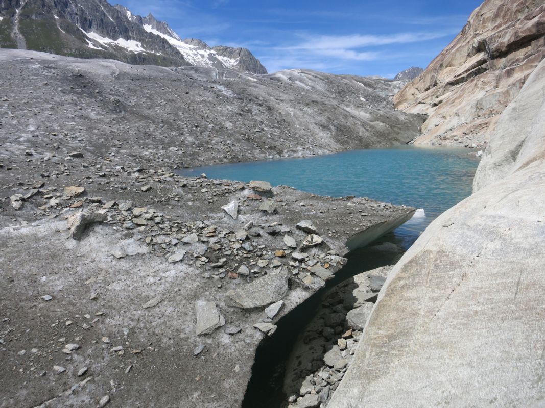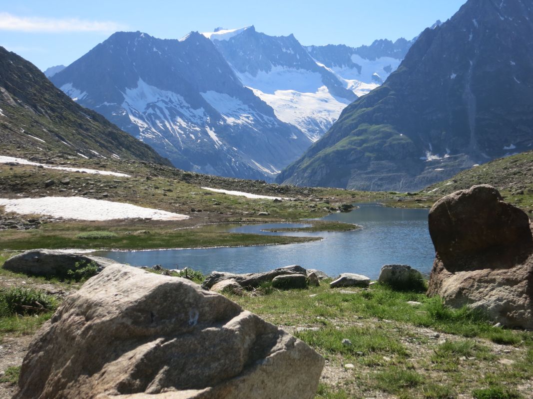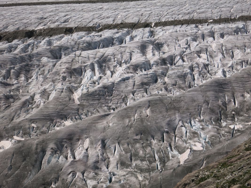 Am 2.Tag stand zunächst die Anreise zur Bettmeralp auf dem Programm. Nach dem kurzen Abstieg vom Hotel zurück zur Riederalp nahmen wir den kleinen Elektrobus (Shuttlebus) zur Gondelbahn auf die Bettmeralp. Diese führte uns dann hinauf zur Bergstation Bettmergrat auf (2647 m.ü.M.). Beim nahen Aussichtspunkt erblickten wir dann zum ersten mal diesen riesigen Aletschgletscher und waren einfach überwältigt von diesem Anblick! Gleich rechts dieser Aussichtsplattform begann schliesslich die Wanderung entlang dieses imposanten Gletscherstreifens. Auf schmalen Wegen, mal durch Geröllfelder, mal durch kleinere Schneefelder (man war gerade noch daran den letzten Schnee von den Wegen zu befreien) wanderten wir etwas erhöht oberhalb des Gletschers, im Sichtfeld nicht nur dieser unbeschreibliche Gletscher (mit Sicht bis zum Konkordiaplatz) sondern auch verschneite Berge, blauer Himmel... Einfach wunderbar! Bald erreichten wir dann die Ebene beim Märjelensee (2300 m.ü.M.), welche mit ihren riesiegen Felsplatten und Picknickmöglichkeiten nebst uns auch viele andere Wanderbegeisterte zum Pause machen und Mittagessen einlud. Bevor wir uns dann auf den kurzen Weg zu unseren zweiten Uebernachtungsort, die "Gletscherstube", machten, nahmen wir noch den Abstieg zum Gletscherrand auf uns und bestaunten dort am Rande des kleinen Sees die meterhohen Gletschermassen. Die Sonnenterrasse der Gletscherstube erreichten wir bereits am frühen Nachmittag, so dass ich nochmals eine zusätzliche kleine Wanderung (2 x ca. 20 min) zur "Platta" machte, wo man erneut einen wunderbaren Ausblick auf den Aletschgletscher geniessen kann.
