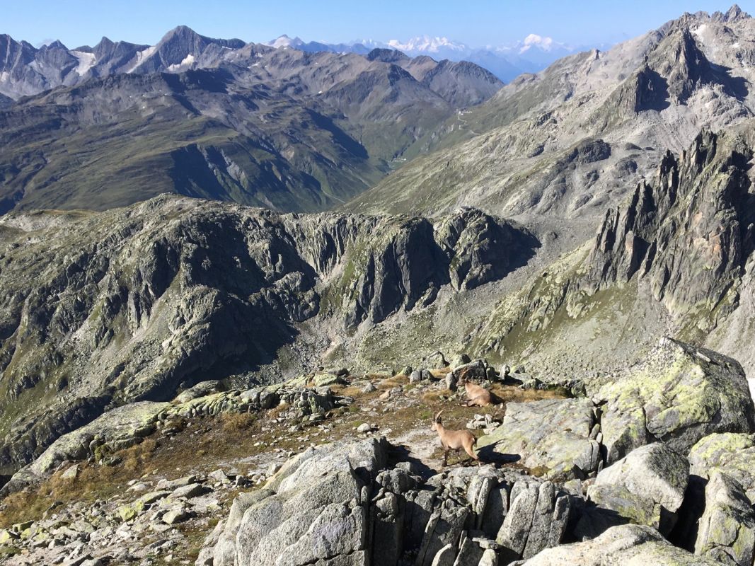 Am nächsten Morgen startete ich bei Sonnenschein & blauem Himmel um 08.00 Uhr zur 2.Etappe. Die Wanderung bis zur Göscheneralp dauert offiziell ca. 4h 30 min. Das zeitliche Ziel war, um 14.15 Uhr den Bus von der Göscheneralp hinunter nach Göschenen SBB zu erreichen. Es ist nötig, mindestens 2 Stunden vorher die Busfahrt telefonisch anzumleden bzw. zu reservieren. Auch bei der heutigen Etappe handelt es sich um eine Alpinwanderung (blau-weisse Markierung). Nach einem kurzen Abstieg zweigt die Route zur Lochberglücke steil links hinauf. Das Gebirge liegt direkt vor einem und man überlegt, wo diese "Lücke" über den Berg wohl sein könnte. Schliesslich gelangt man auf eine wunderschöne Ebene mit winzigen Seen und Bächen, von welchem man mindestens einen über Steine traversierend überqueren muss. Ab hier gehts dann steil hoch, oft über Felsblöcke & Geröll und kurz vor der Lochberglücke über ein kleines Altschneefeld. Die Lochberglücke liegt auf 2815 m.ü.M., dies ist gleichzeitig der Höchste Punkt dieser 2-tägigen Wanderung. Zu meinem grossen Glück kletterte ich für eine kurze Pause noch auf die Felsblöcke hoch, denn dadurch sah ich zu meiner riesigen Freude nochmals das grandiose Bergpanorama vor mir und direkt unter mir 2 Steinböcke...!!! Wow, auf diesen Augenblick habe ich schon lange gewartet und nun kann ich sie aus einer Distanz von 10 - 15 m in aller Ruhe beobachten. Im Angesicht der Steinböcke nehme ich mein Znüni zu mir und vergesse fast etwas die Zeit. Schliesslich gehts über weitere Fels- & Geröllmassen abwärts, zweimal muss man noch ein Schneefeld überqueren / hinabrutschen und schon bald erkennt man weit unten den Göscheneralpsee. Die Szenerie wechselt von felsig grau zu grün, aber auch dieses letzte Wegstück erfordert aufgrund des steilen Abstieges, den rutschigen Gräsern & Gesteinen sowie unebenen Wegen nochmals erhöhte Konzentration. Noch bevor man die 1000 Höhenmeter Abstieg ganz geschafft hat, erblickt man zur Linken nochmals eine wahre Traum-Szenerie: Den Dammagletscher mit dem Dammastock, der mit 3630 m.ü.M. höchste Gipfel der Urner Alpen. Direkt hinter dem Staudamm liegt das Restaurant Dammagletscher (ca. 1800 m.ü.M.) , von wo ich schliesslich bereits um 12.15 Uhr das Postauto hinunter nach Göschenen nahm.